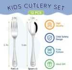 FRIENDLY TRANSITIONAL SMALL UTENSILS: This toddler silverware set includes 6 forks and 6 spoons, providing ample quantity that’s perfect for families with multiple kids. It meets the dining needs of toddlers, preschoolers, and school-age children, helping them smoothly transition to full-size cutlery. The included cutlery bag also makes it easy for kids to take their utensils to school or other occasions, enhancing their dining experience.