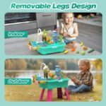 4 in 1 Water Sink Toys:This 4-in-1 water toy for kids combines kitchen toys, water play toys,fishing game and water table. Fruit, vegetables, cups, fork, plate, sponge, cloth, and brush provide an enjoyable dishwashing experience. Duck, frog, whale, octopus, water wheel, and slide offer a fun water play experience. Fishing rod, hooks, and fish immerse children in a fishing game.The legs of the water table are detachable, which can provide children with two different water play modes and enhance children’s gaming experience.