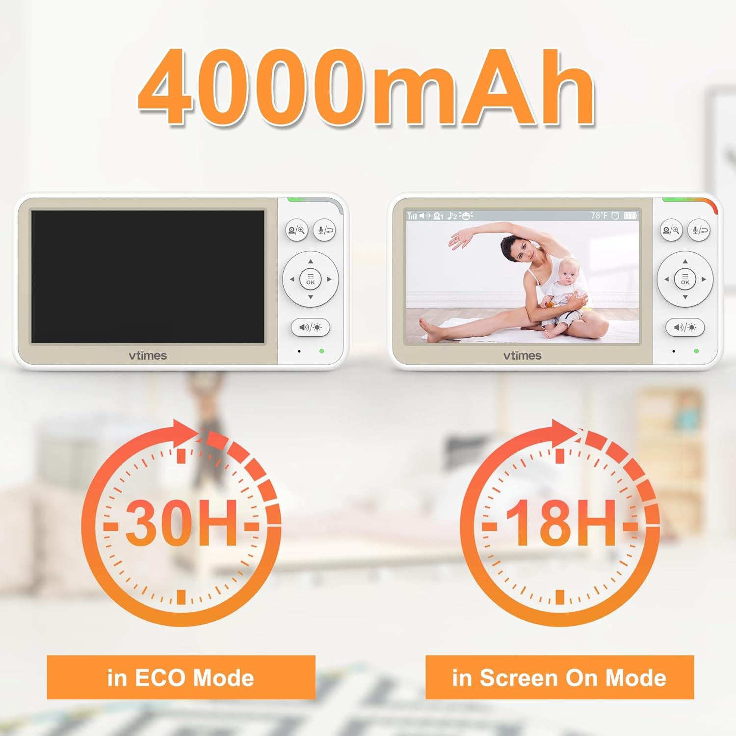 【Long-lasting Battery】Equipped with a powerful 4000mAh battery, our video baby monitor ensures extended usage time for uninterrupted monitoring. In ECO mode, the battery can last up to 30 hours, while the screen-on mode can maintain up to 18 hours of continuous operation. Day and night, it’s your reliable guardian for your baby’s safety and security.