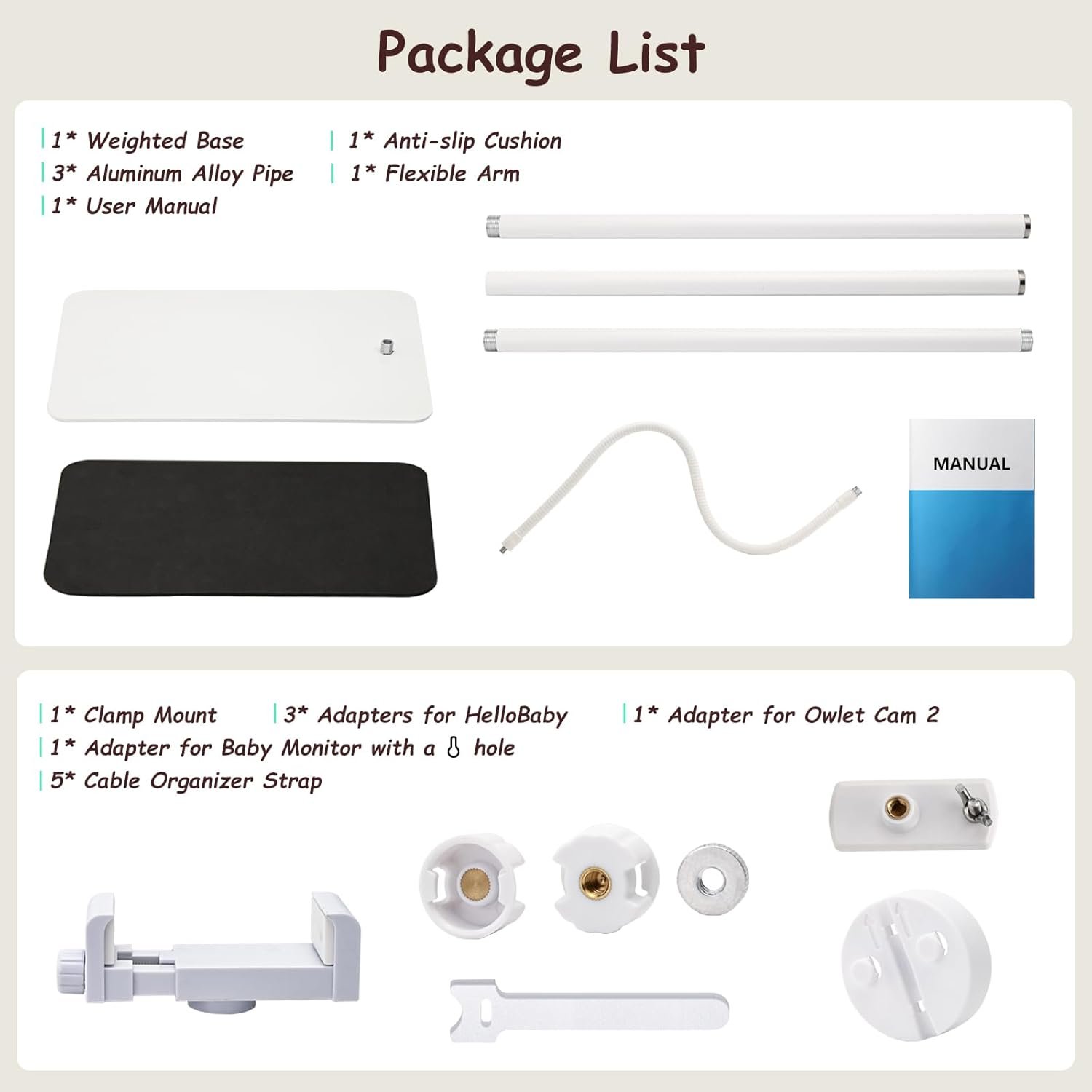 【Flexible Baby Monitor Mount】Featuring an adjustable gooseneck arm design, this baby monitor floor stand can be easily bent in any direction, you can adjust and bend its height and angle to get the best position for you. The arm at the top of the stand is metal, providing solid and reliable support for the camera (supporting up to 2.2lb).