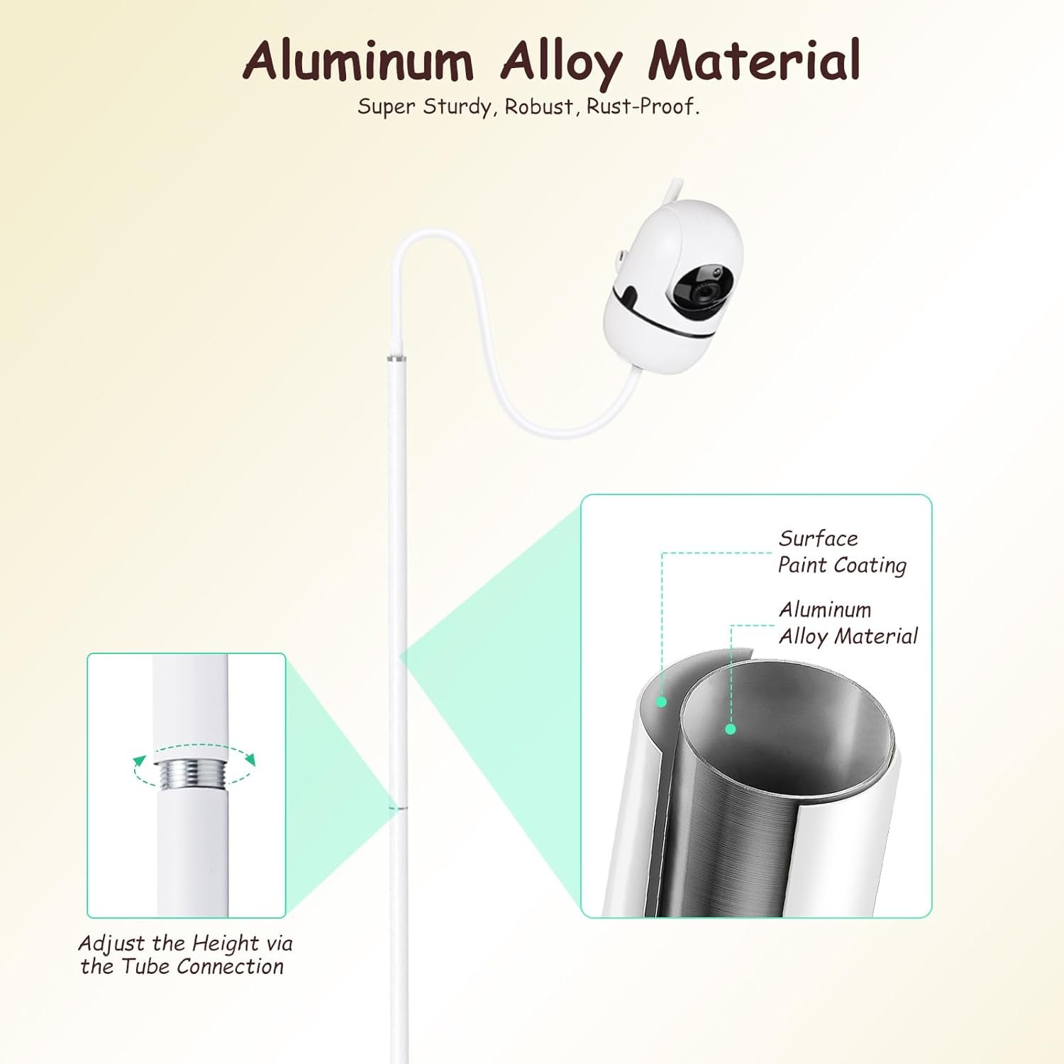 【37.5-68.8inch Adjustable】The floor stand is made of premium-grade Aluminium, sturdy, rust-proof. The surface is coated with eco-friendly paint, non-toxic and harmless. The height of the baby monitor floor stand can be freely adjusted between 95cm-175cm to meet different scenario requirements. Every movement of your baby is visible.