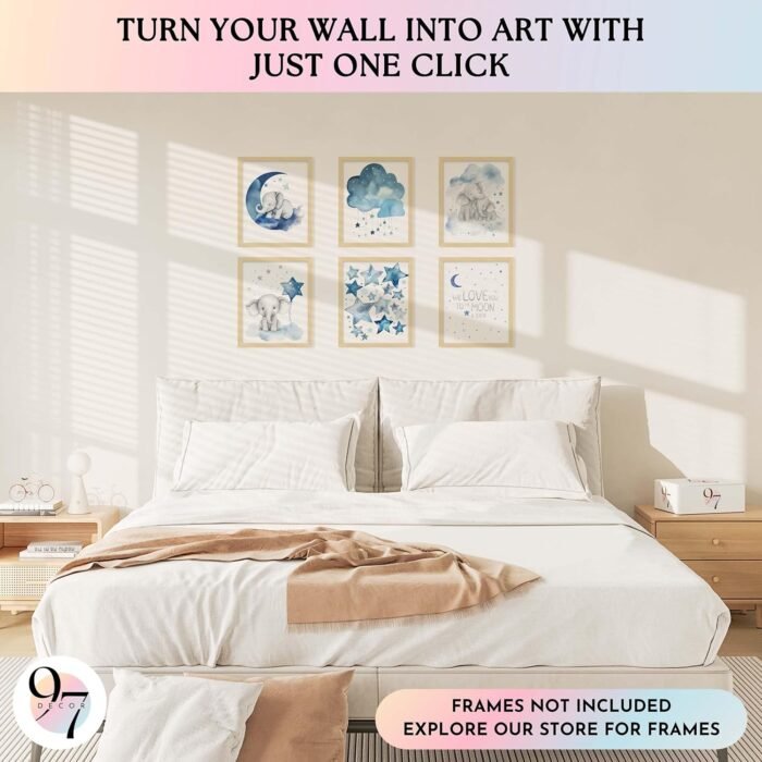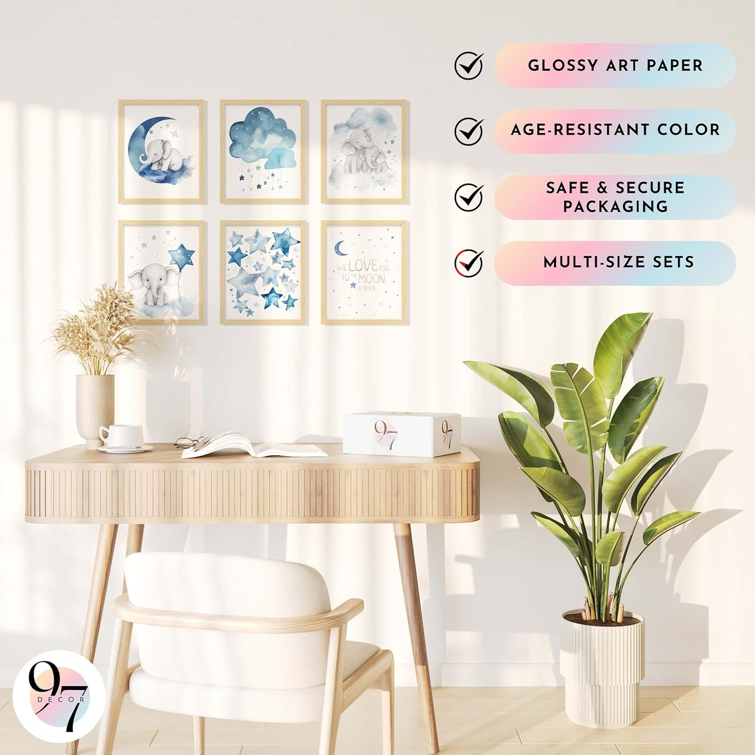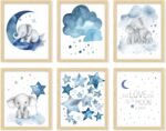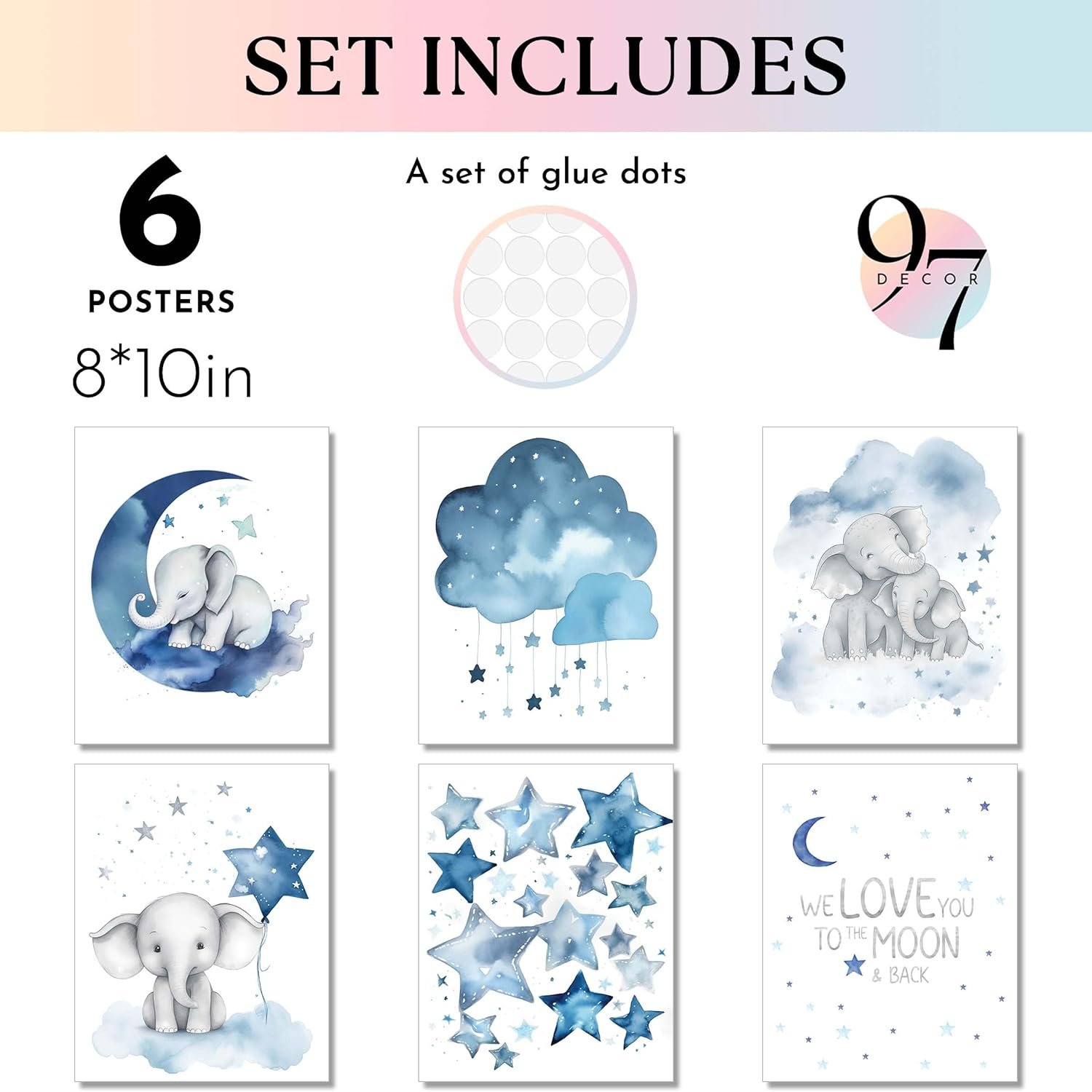 Set include: Elevate your baby room decor for boy with this comprehensive set that includes 6 beautifully designed 8×10″” posters. Our elephant decor for nursery brings together baby animals and celestial elements like moon and stars for an enchanting ambiance