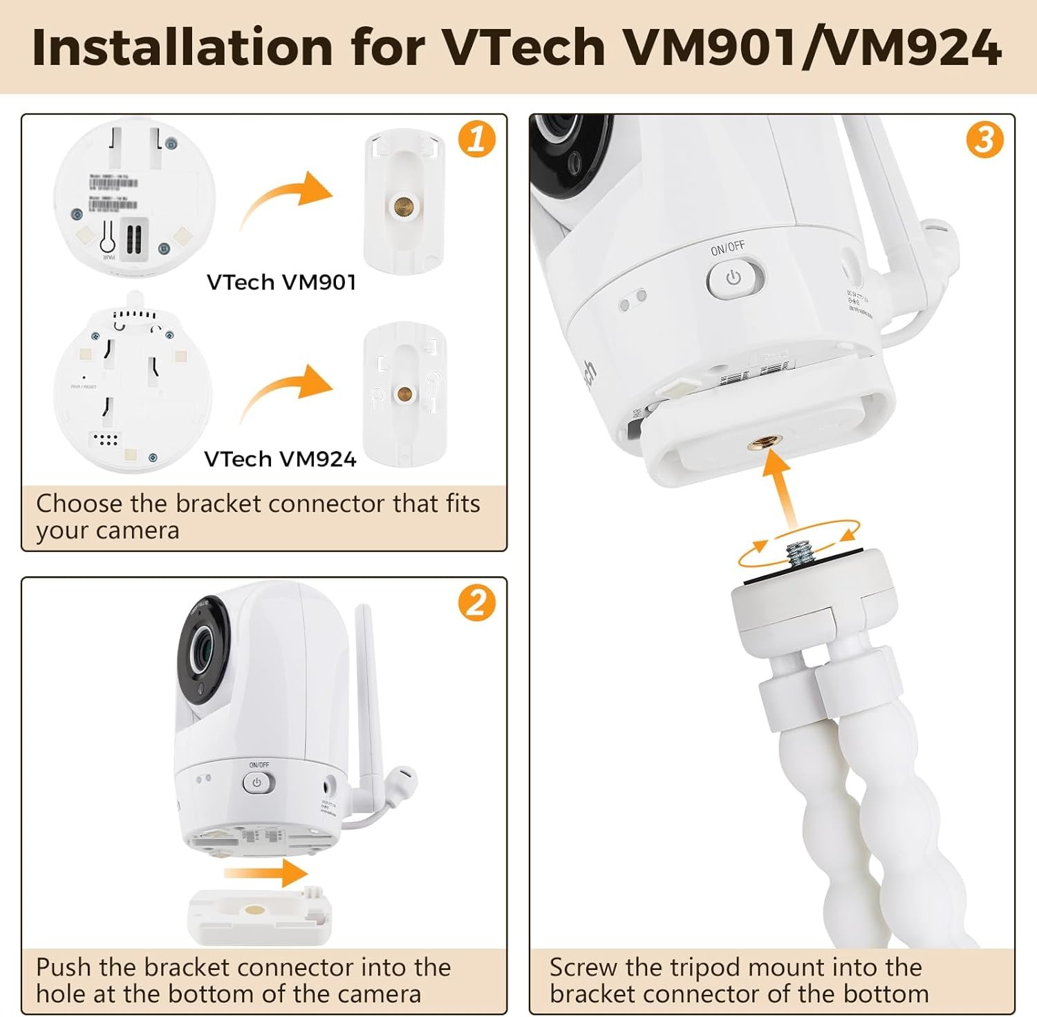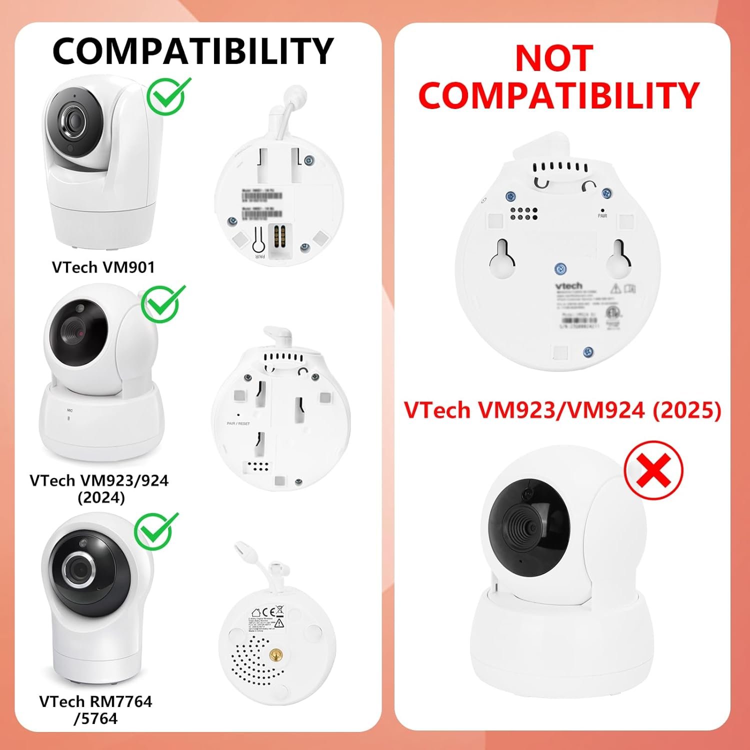 This baby monitor mount specifically designed for the VTech camera, compatible with VTech VM901 and VM924 baby monitor, and other baby cameras with 1/4 threaded hole. (The VM923/VM924 2025 new version base is not compatible. )