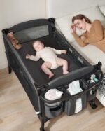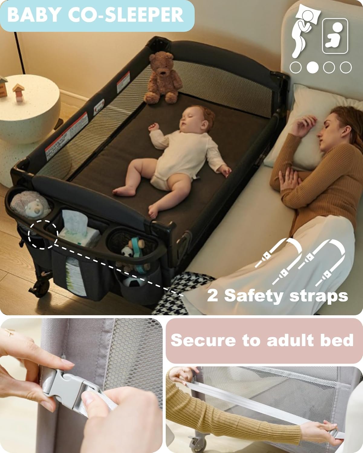 【UPGRADE 4 IN 1 |BEDSIDE SLEEPER+CHANGING TABLE+BASSINET+PLAYARD】AirClub baby 4 in 1 bedside sleeper boasts all-in-one genius features. Bedside crib function can provide baby with the needed comfort and comfortable sleep; Portable changing table make changing diapers become more comfortable and easier for new born family; Bassinet and playard function can provide a safe place for baby to sleep and play.