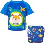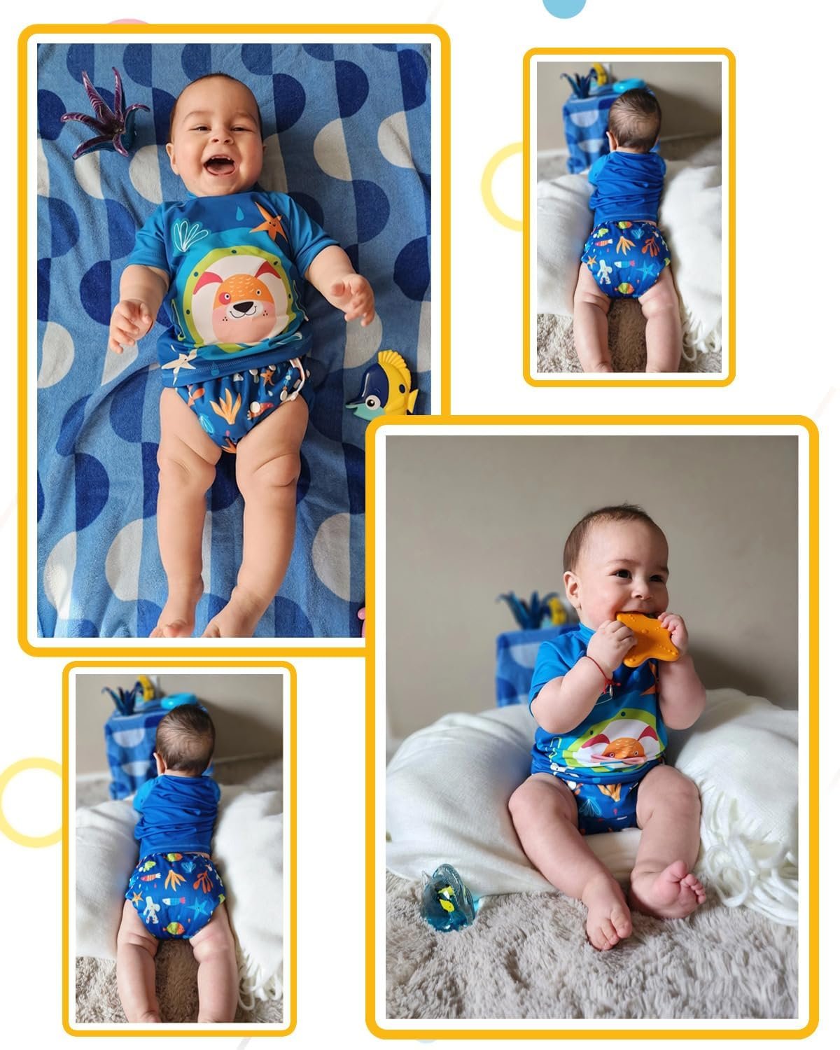 Top: Short Sleeve design, are made of soft polyester and spandex, making them ideal for your little one’s beach or pool time. Swim diaper : Unique Polyester Mesh and waterproof Polyester with PUL, designed for holding solids. 3×3 snaps adjust around the waist and legs with different sizes.