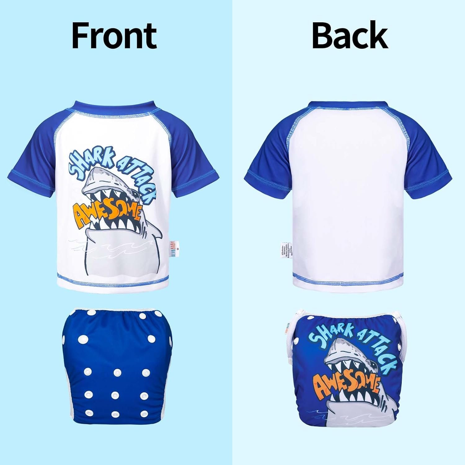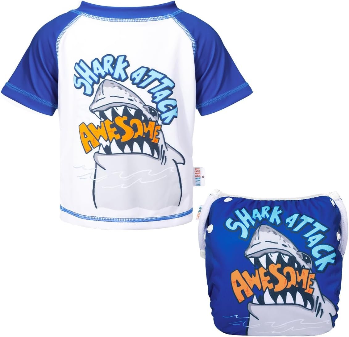 Top: Short Sleeve design, are made of soft polyester and spandex, making them ideal for your little one’s beach or pool time. Swim diaper : Unique Polyester Mesh and waterproof Polyester with PUL, designed for holding solids. 3×3 snaps adjust around the waist and legs with different sizes.