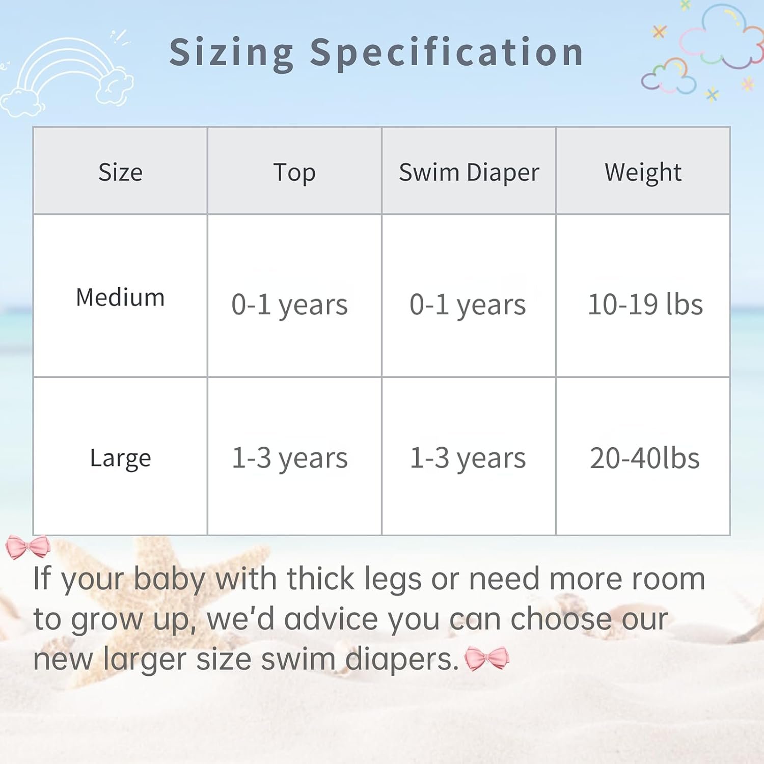 L size: swim diapers can fit baby 1-3 years, suitable weight:20-40lbs.