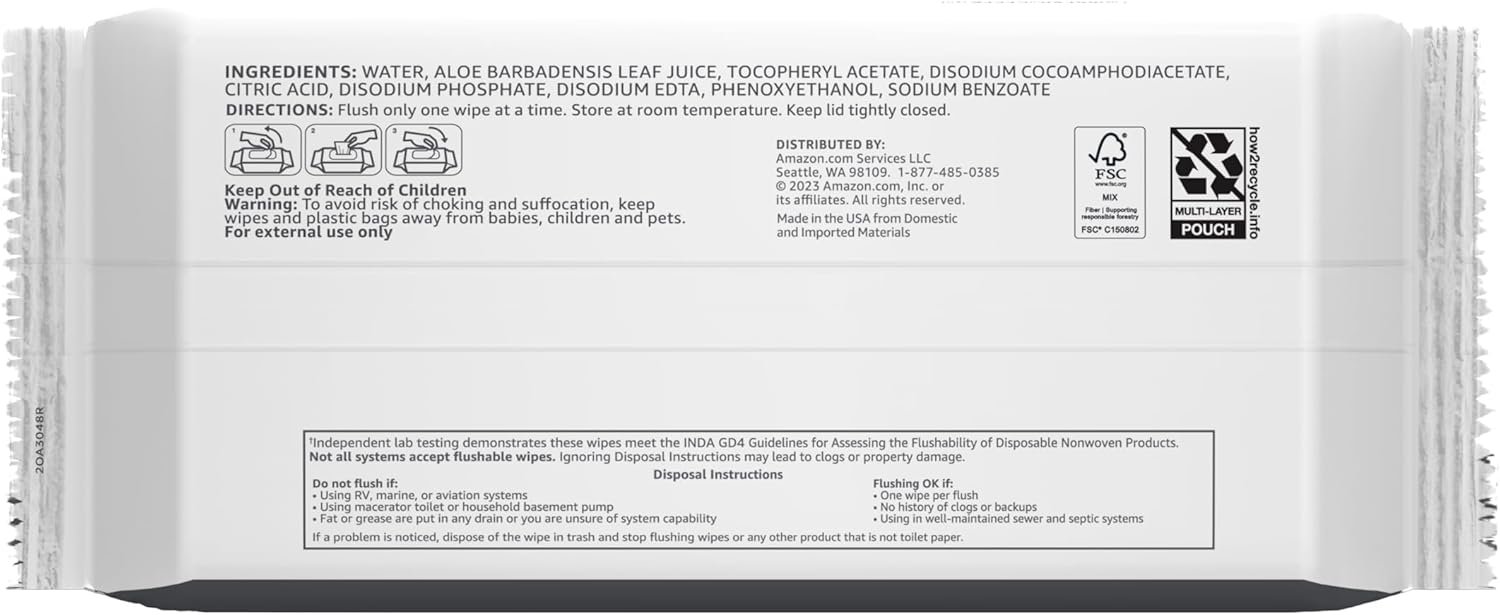 FLUSHABLE & FSC CERTIFIED: FSC-certified Amazon Basics Extra-large Flushable Wipes (FSC N004130). Made with materials from well-managed forests, recycled materials, and/or other controlled wood sources.