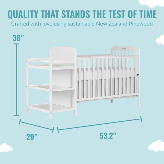 The Anna 4-In-1 Full Size Crib & Changing Table Combo is a stylish and functional investment that keeps pace with your child’s changing needs. Convert it from a crib to a toddler bed, and then a daybed (Toddler Guardrail/Stabilizer/Full Size Rail sold separately) as your child grows.The changing table with two storage shelves adds to the utility. The changing table is equipped with a custom fit 1” changing pad. There are two open storage shelves beneath the table, allowing you to keep baby essentials handy.The Anna features a sleek and modern design with clean lines. You can choose from six elegant finishes- Black, Cherry, Espresso, Natural, White & Storm Grey and match it effortlessly with any nursery theme! All Dream On Me cribs are tested to ensure all applicable ASTM, JPMA & CPSC standards are met. This Anna comes with a stationary (non-drop side) rail system for added safety. All tools for assembly are included, conversion kit sold separately. Choose any Dream On Me non-toxic, Greenguard certified standard crib mattress for the perfect fit. Maximum weight limit is 50 lbs.
