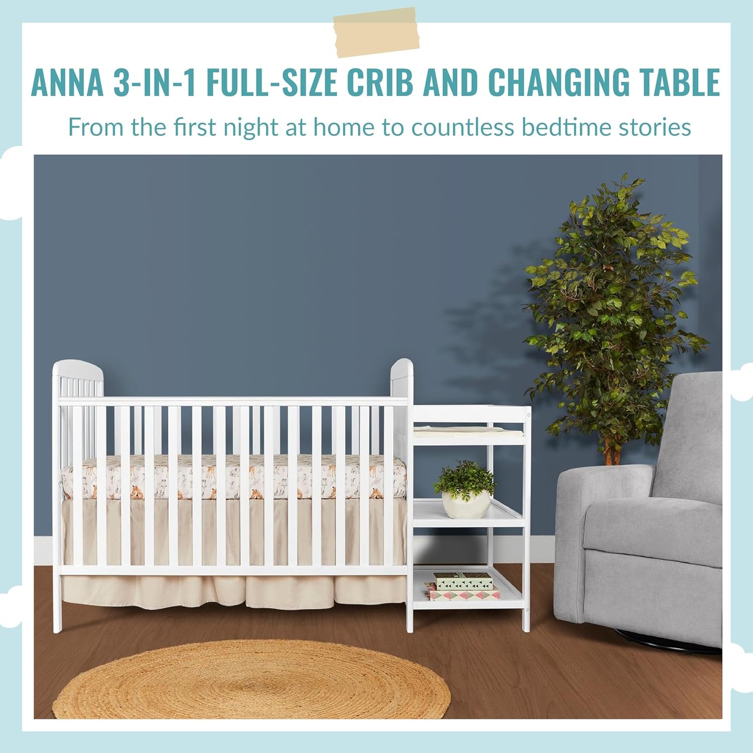 CONVERTIBILITY OPTIONS: The Anna grows with your baby. Convert it from a crib to a daybed (Conversion kit sold separately). The attached changing table with two storage shelves adds to its utility