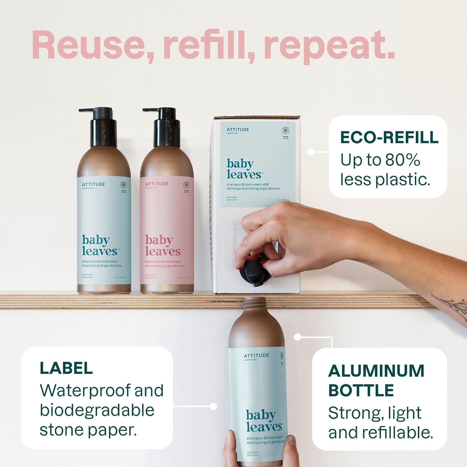 RESPONSIBLE PACKAGING: Aluminum bottle with reusable pump designed to be refilled and to reduce plastic waste