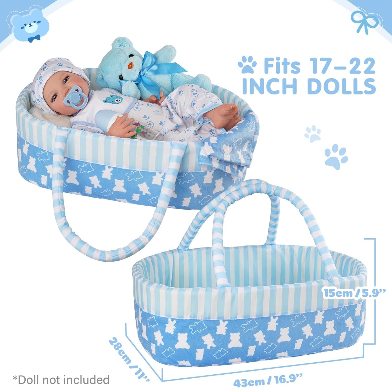 BABY DOLL CLOTHES SIZE: This 9 pcs reborn baby doll clothes with baby doll bassinet set perfect suitable for 17-22 inch realistic baby dolls, and these baby doll clothes and baby doll accessories can be hand washed or machine washed and reused