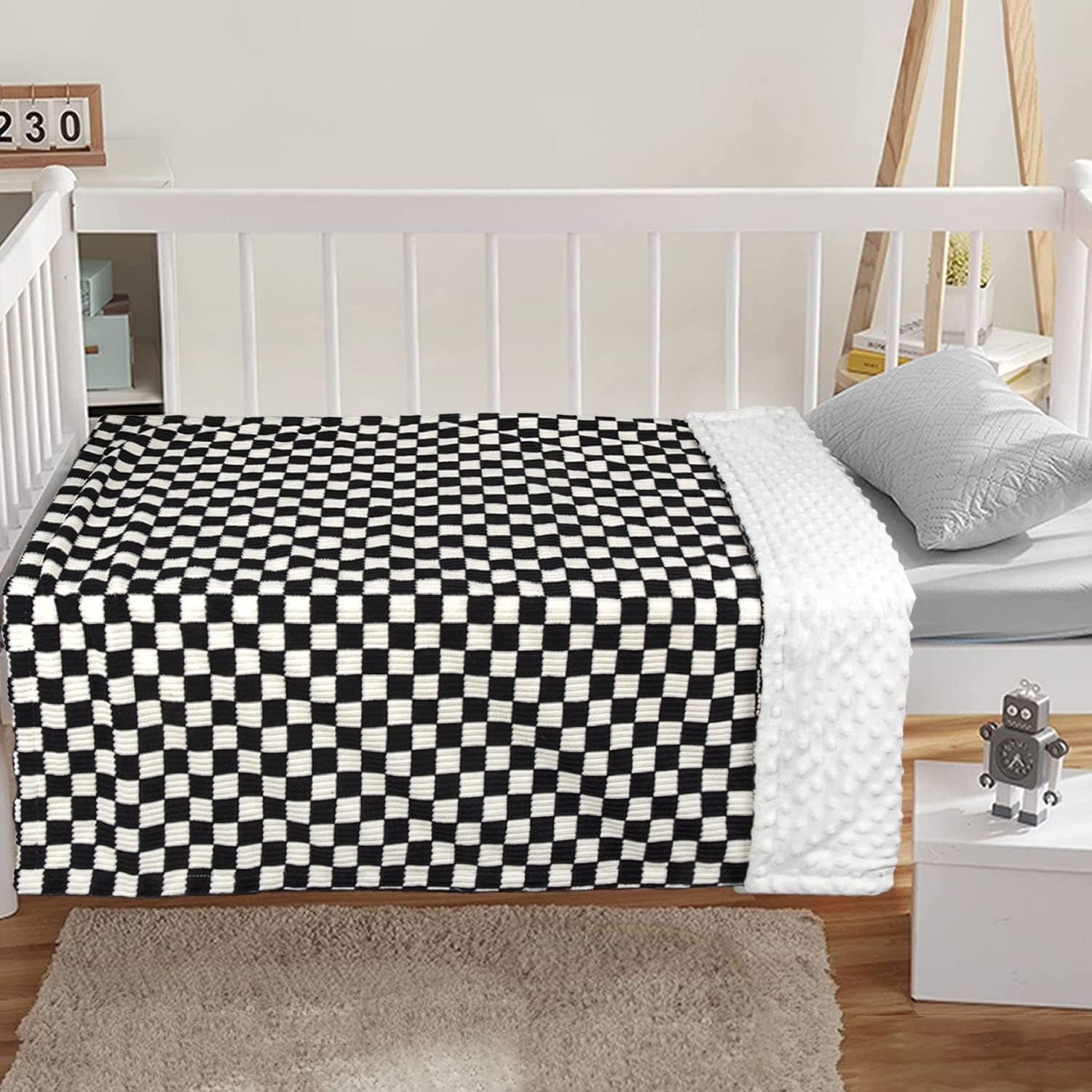 Customers like the softness, design, and material quality of the blanket. They mention it’s very soft, cute, and the perfect size. Some are also satisfied with its thickness, warmth, and washability. However, some customers have reported that the white on the checkered side isn’t white, but a cream color.