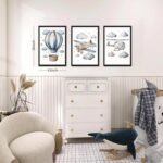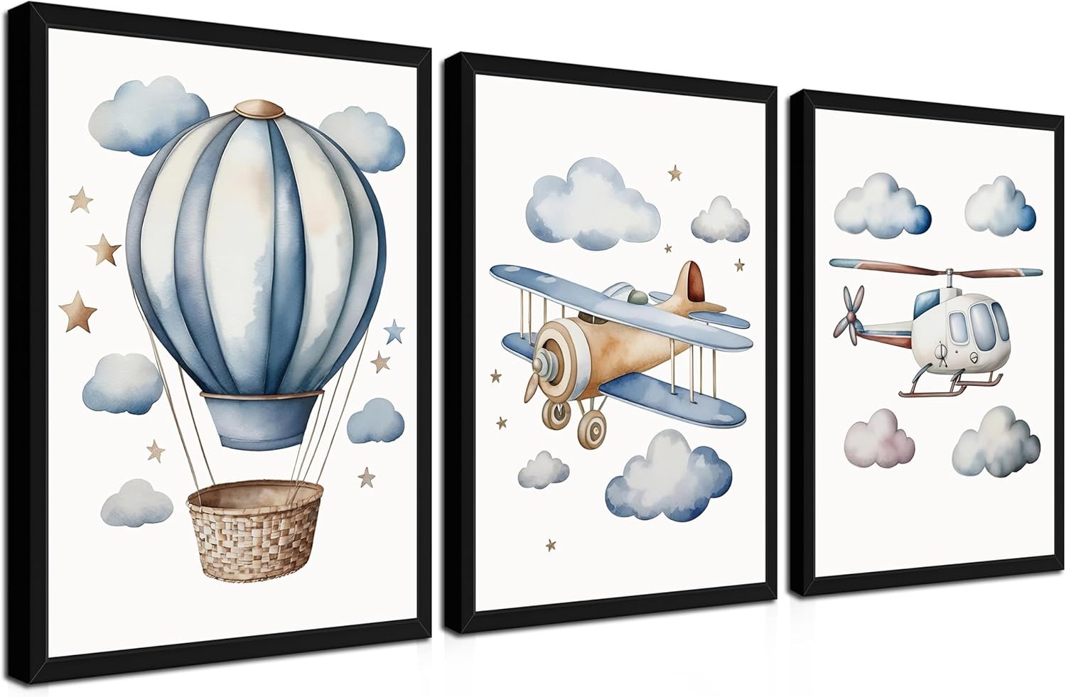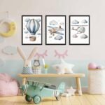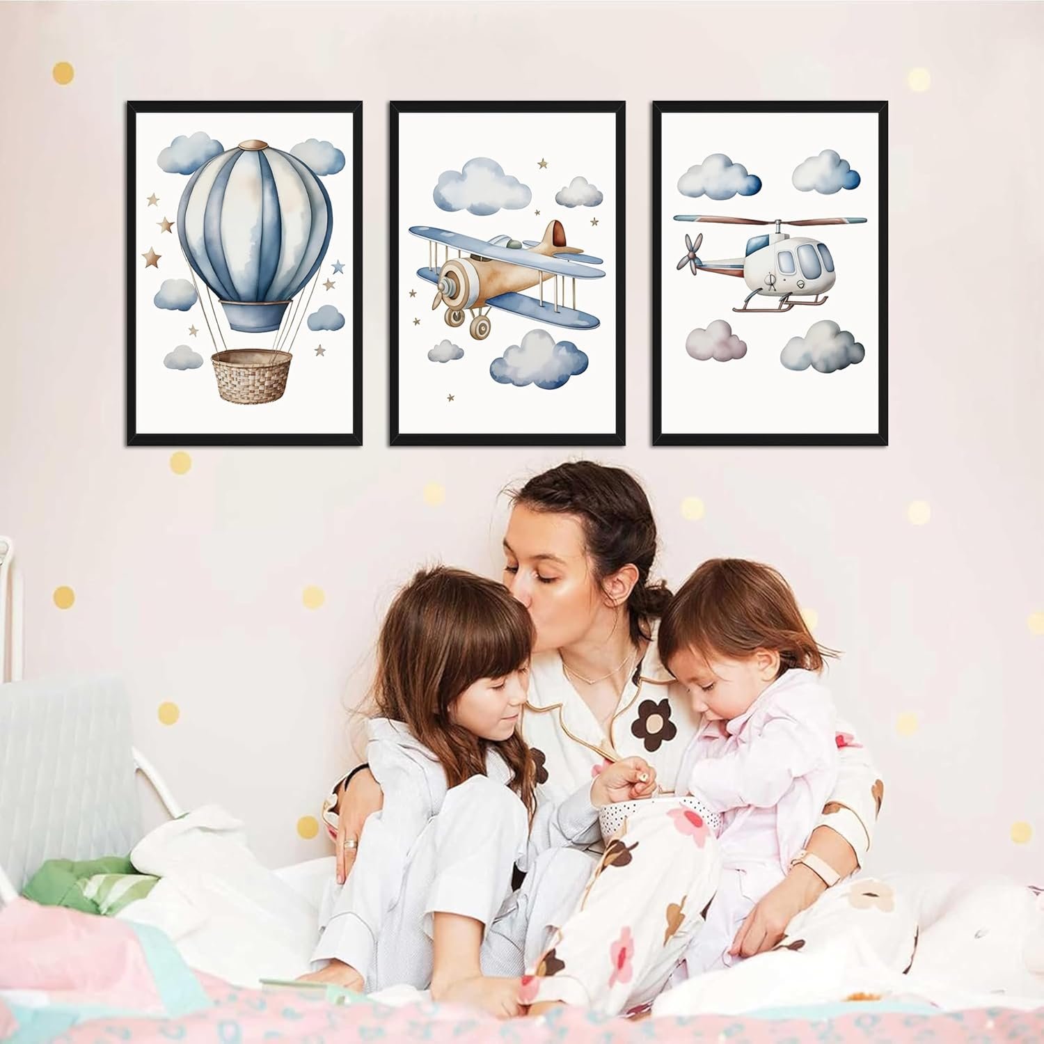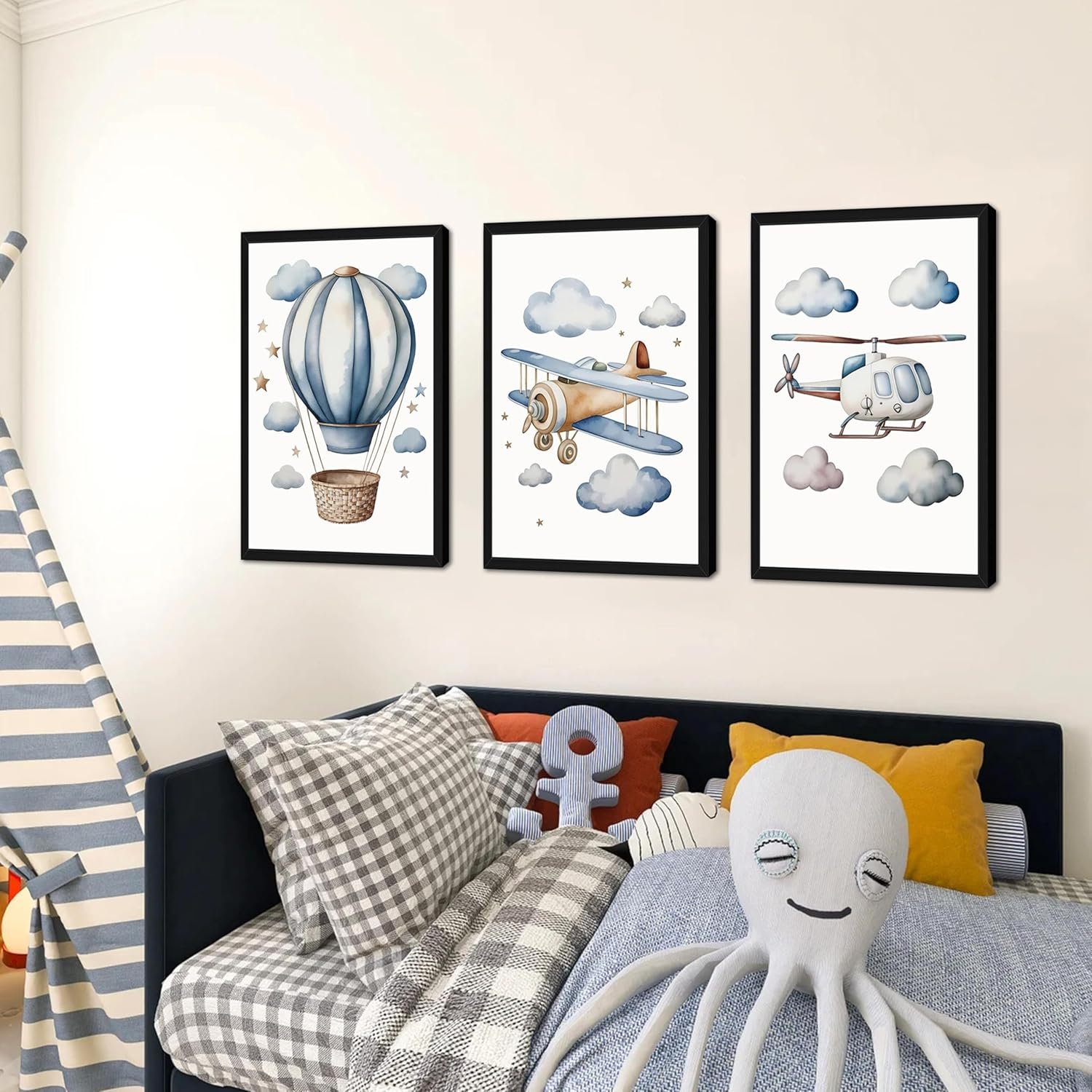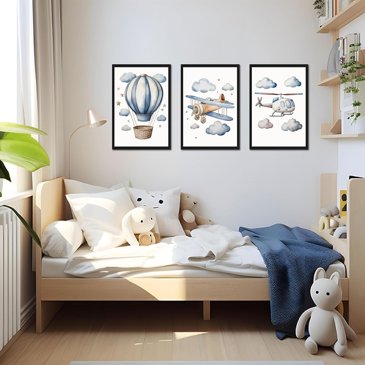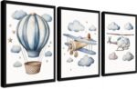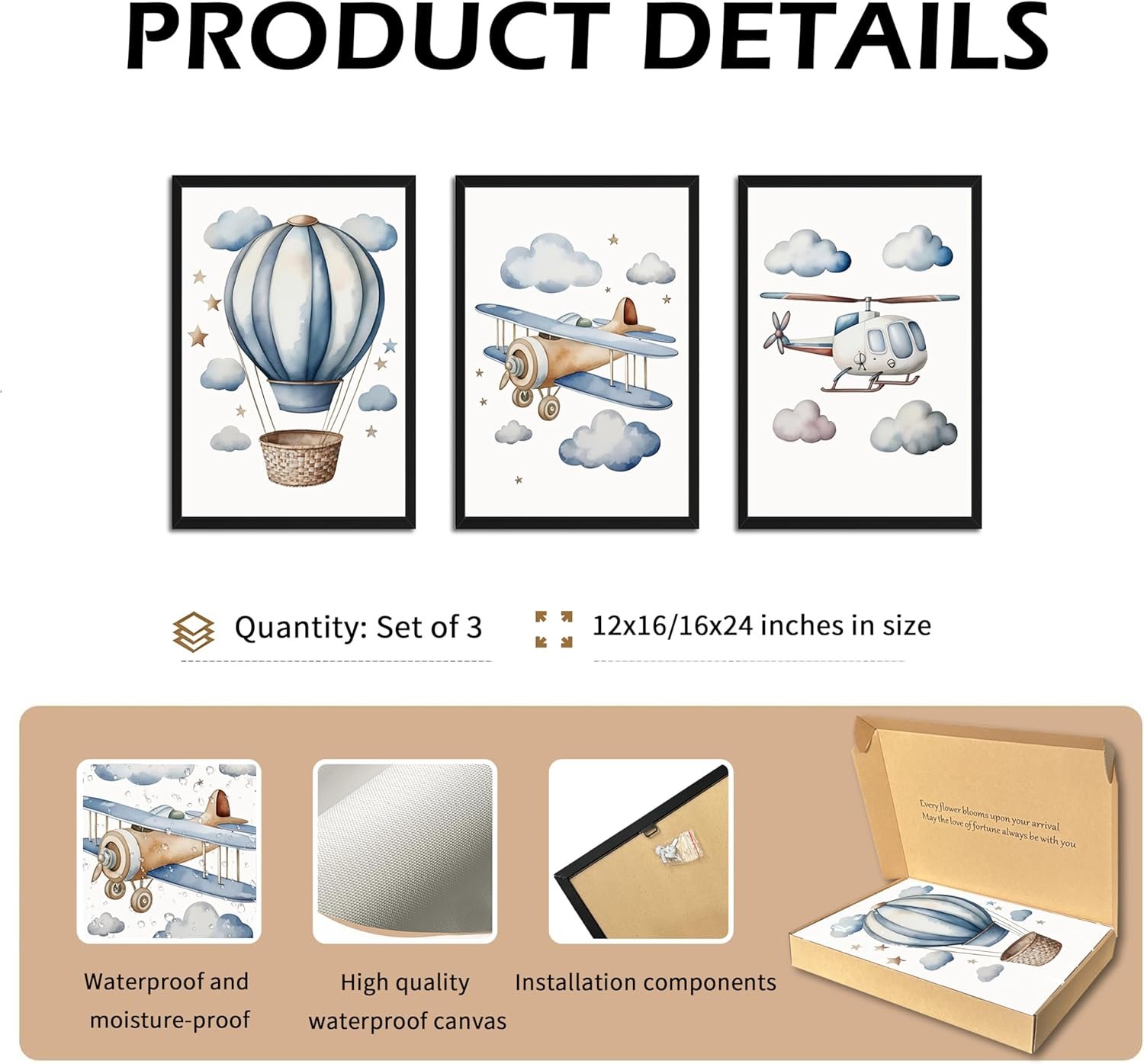 【Charming Boy Nursery Decor】Transform your space with this adorable boy nursery wall decor set, designed to bring a sense of adventure to any baby boy’s room. Featuring vintage-style hot air balloon, plane, and helicopter illustrations in soft baby blue, it’s a delightful match for baby boy nursery wall decor and blue nursery decor themes.