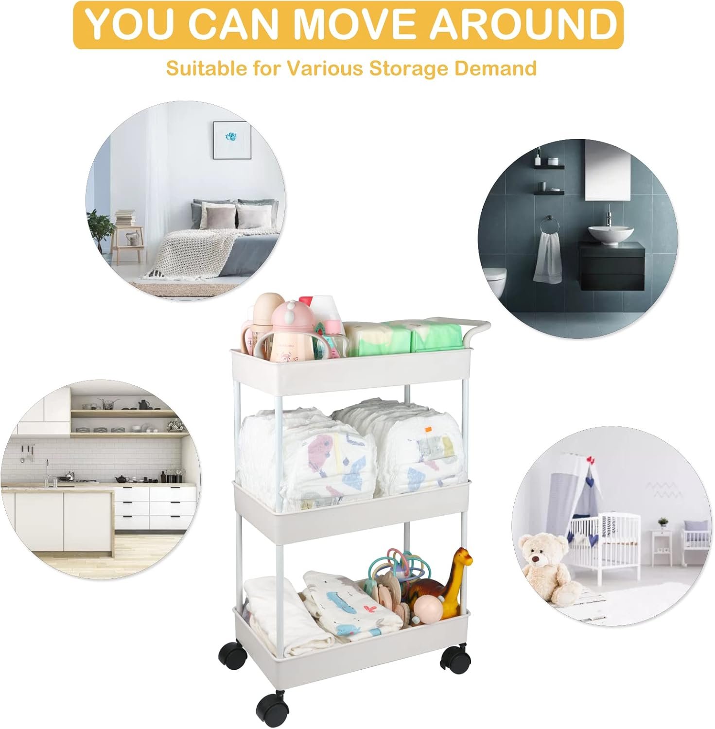 Sturdy & Durable: This diaper cart organizer with wheels is designed with a 3-tier ABS material tray and sturdy pipe, with great loading. Waterproof and anti-corrosion
