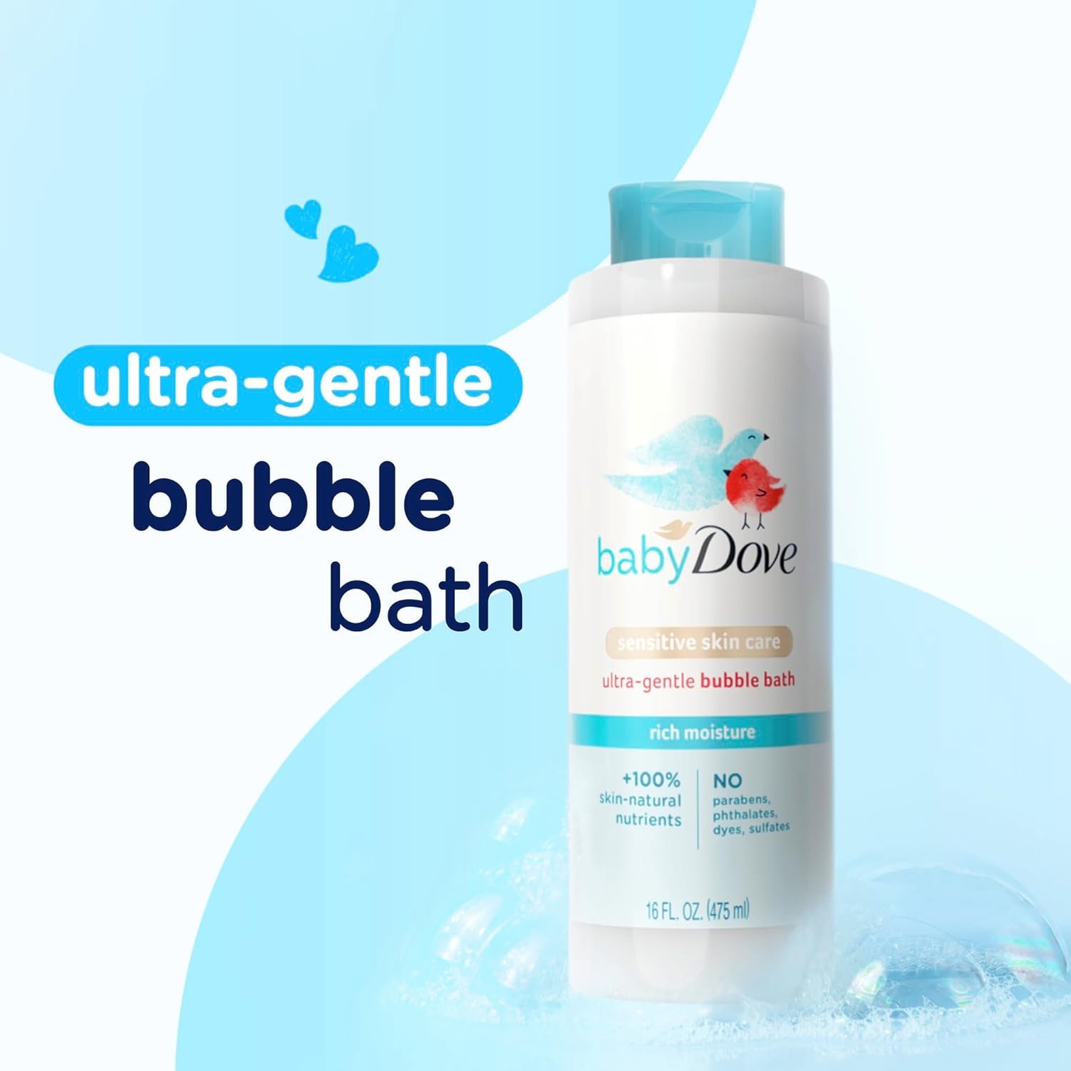Make every bath time a bonding moment filled with care and fun, with Baby Dove Sensitive Skin Care Rich Moisture Bubble Bath. Lovingly blended with 100% skin-natural nutrients, this moisturizing formula is as mild as water, making it the gentlest baby bubble bath for sensitive skin. Your little one will delight in the long-lasting, soothing bubbles that help retain skin’s natural moisture, leaving their sensitive skin feeling cared-for and nourished. This is a safe bubble bath for kids and babies, that’s gentle enough for even the most delicate newborn skin. Non-drying, hypoallergenic and tear-free, this gentle bubble bath is dermatologist, ophthalmologist and pediatrician tested and contains no parabens, phthalates, dyes or sulfates. Bring play to every bath time by pouring a little of this long-lasting bubble bath into warm water, and watch as it foams up in seconds. After your fun bubble bath, complete your little one’s nourishing skin care routine with Baby Dove Rich Moisture Lotion. Each time you use Baby Dove Bubble Bath, you’re choosing care that goes further, as each one comes in a 100% recycled bottle. Baby Dove is also PETA approved, meaning we do not test on animals anywhere in the world.
