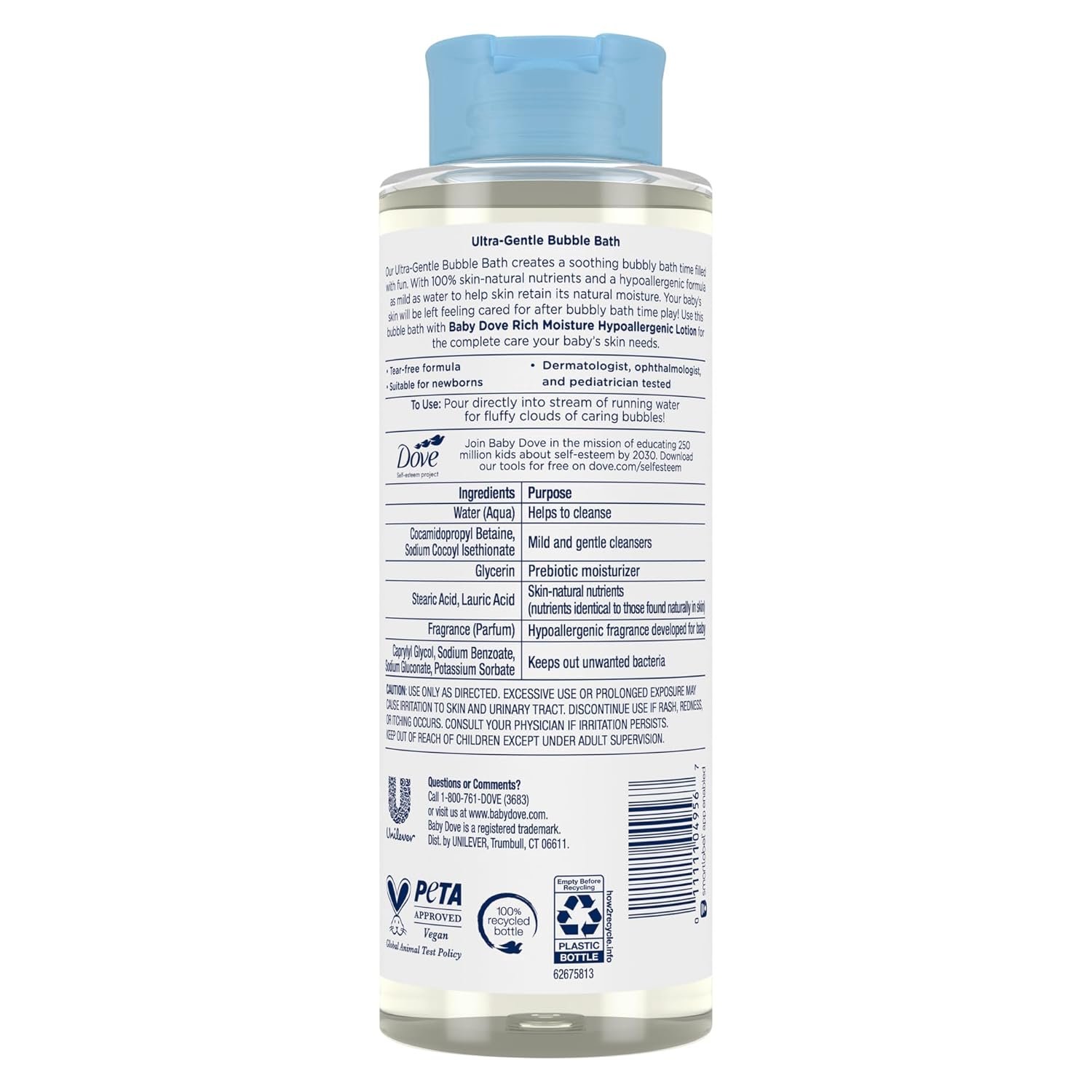 CARE THAT GOES FURTHER: Every Baby Dove Bubble Bath is packaged in a 100% recycled bottle, and Baby Dove is PETA approved, meaning we do not test on animals anywhere in the world.