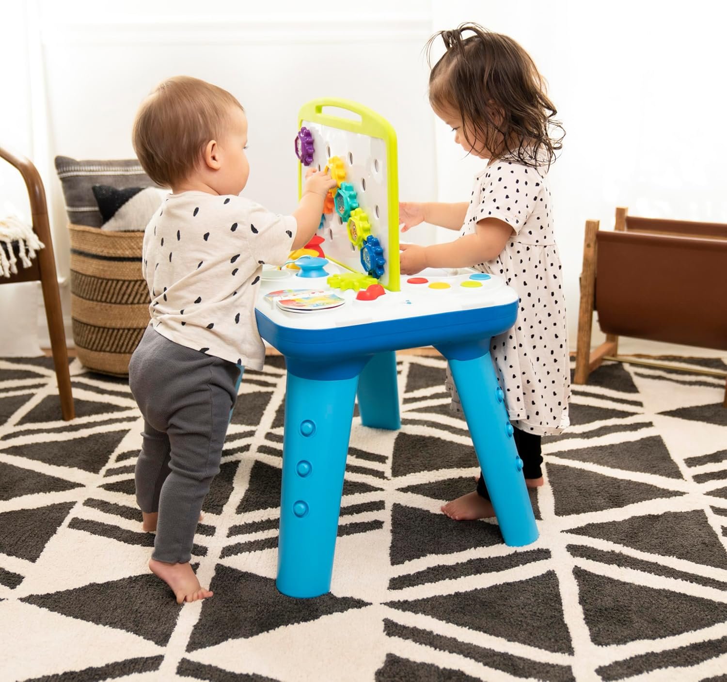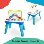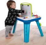 Inspire your child’s curiosity with Baby Einstein’s Curiosity Table Activity Station. From removable, spinning gears to color-discovery circuits and flashing lights, this two-sided art and science table will capture your little one’s attention for hours. Made for hands-on learning and inspired by Montessori principles, this table introduces Science, Technology, Engineering, Art, and Math (STEAM) concepts through engaging play. Watch as the gears connect to make the light bulb turn on! Experiment with color using the mess-free “paint pots.” Your little one will love investigating all the gadgets on this double-sided table that grows with baby from crawling to walking and beyond. Discover more than 65 melodies and vocabulary in English, Spanish or French. Volume adjusts to either high or low settings or can be turned off completely. Removable middle art panel can also be attached to the end of the table to make more space for baby’s arts and crafts. Easily convert the table for floor play by removing table legs. A drawing art surface and a dry erase whiteboard leave plenty of room for big brother or sister to join in on the fun too. Pull up a seat – this play station is fun for parents too.