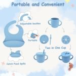 SPECIALLY DESIGNED FOR KIDS: Our baby feeding set will encourage your child to learn new ways to drink and eat independently. The plate and bowl come with a single large suction point, ensuring a firm grip and minimizing spills during mealtime. The cup comes with two kinds of lids for drinking and eating to avoid a mess. Adjustable Light Weight Baby Bib: Our bib can be easily adjusted to four different sizes, accommodating your child’s growth and ensuring maximum comfort and safety.
