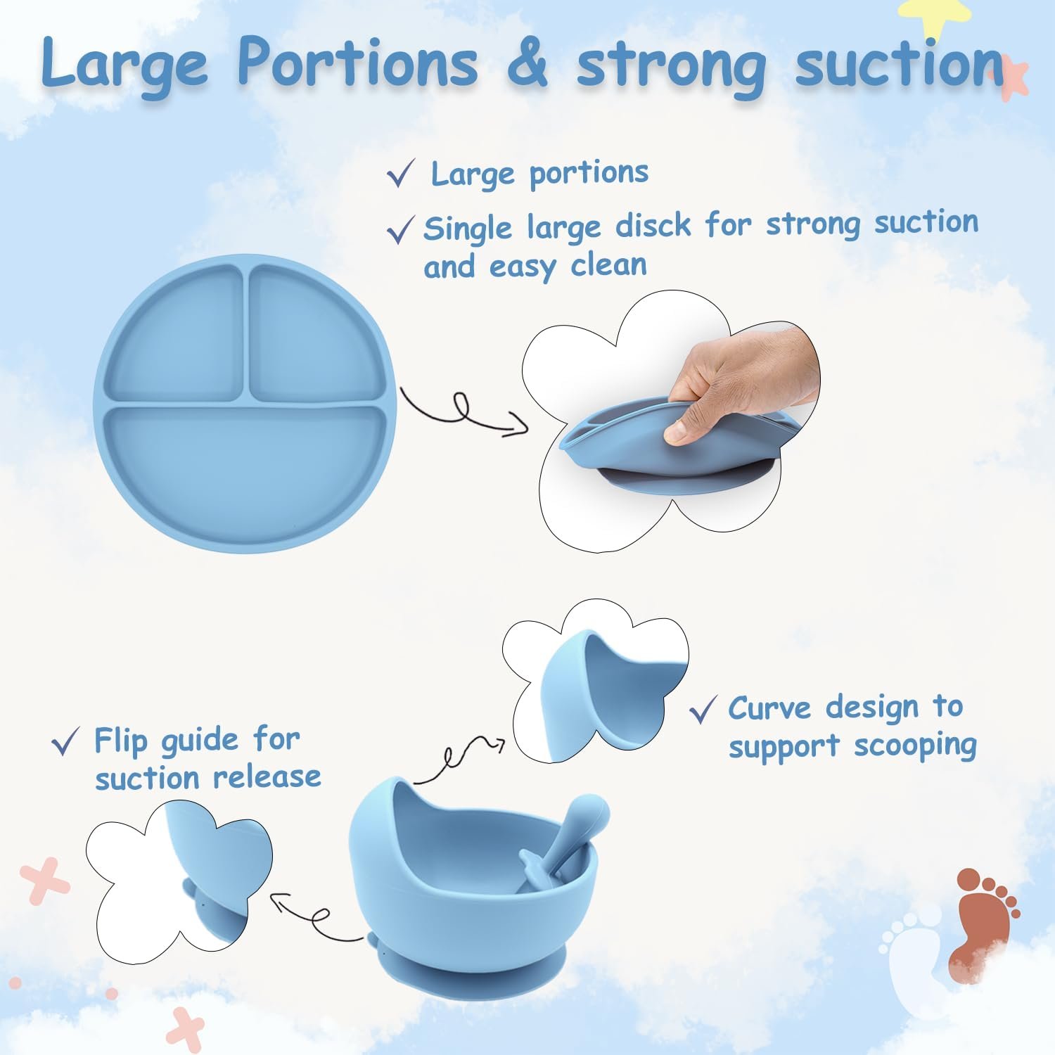 STRONG SUCTION: Feeding a toddler can get messy and the bowl ends up on the floor too often. But our silicone baby feeding set prevents such mess due to a powerful suction mechanism. The suction plate easily attaches to the high-chair tray or any smooth surface, preventing tipping over. It can make meal times mess-free.