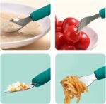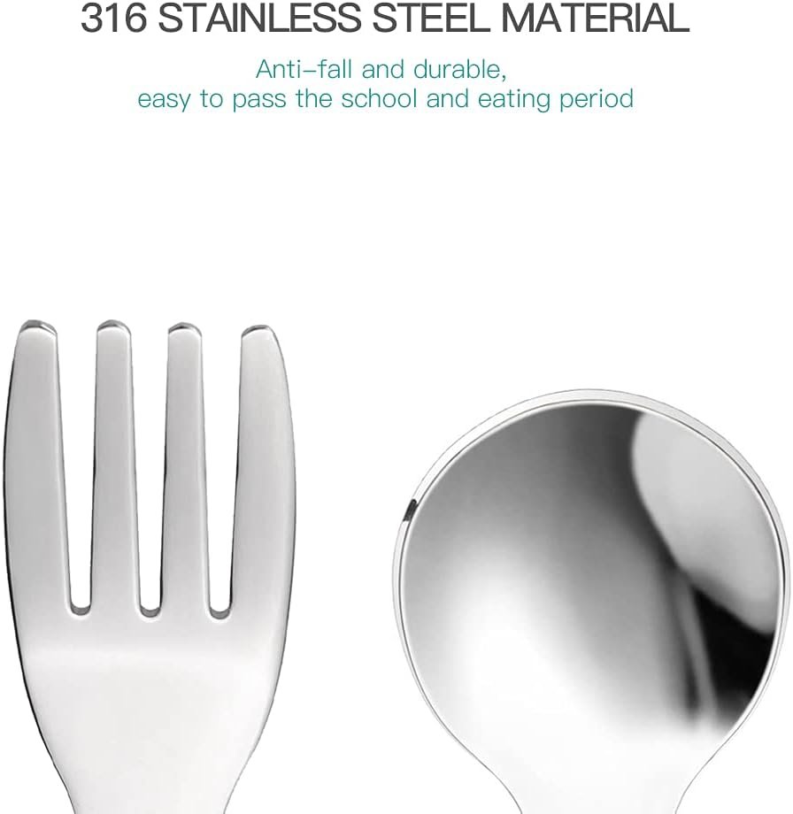 SAFETY AND PRACTICALITY – Rounded and smooth for the baby’s delicate gum and teeth, no sharp edges on the utensils, baby taste more comfortable. The widened tines and round tips on the fork can easily fork fruit and noodles, Baffled Design on the spoon can prevent the spoon from getting too deep in baby’s mouth and better containing the food.