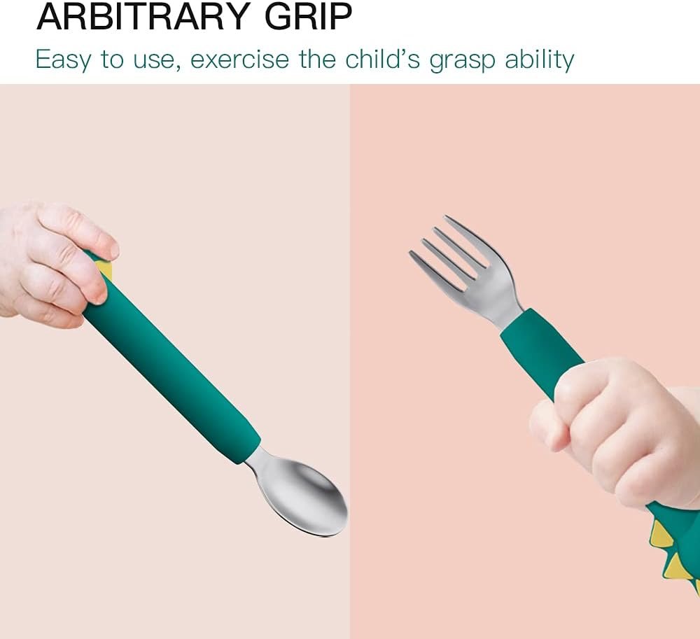 ERGONOMIC DESIGN – The Cutlery’s Ergonomic, wide handle is Covered by Silcone Soft glue, the material is soft and Non-slip which makes it Easy for little hands to grab and Manipulate, Assists Easily in Picking up Food. Ready To Feed with ease!