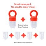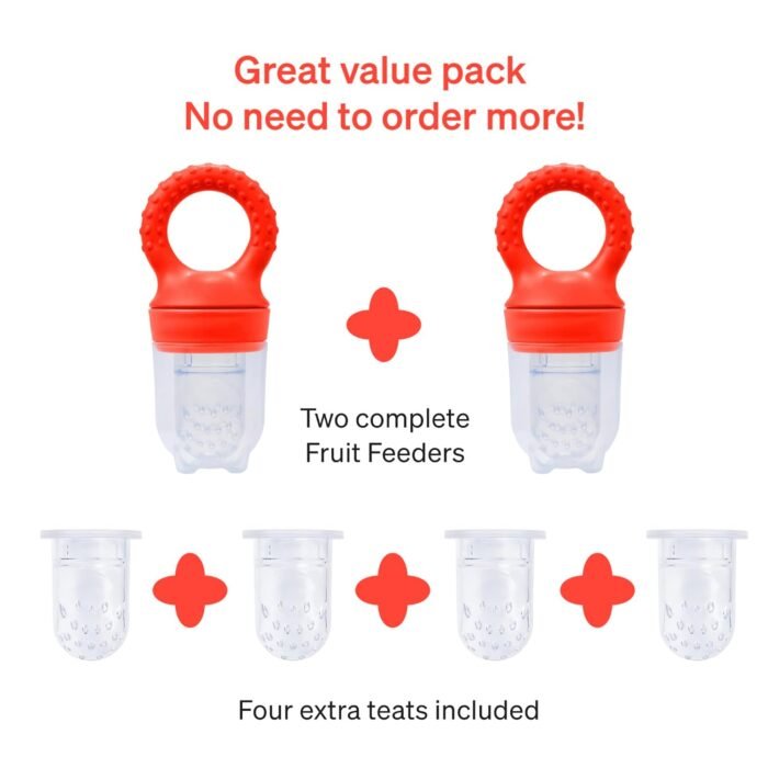 ALL-IN-ONE BABY FEEDING SOLUTION: Our comprehensive package includes not just one but two baby fruit feeders, complete with teething rings, teats, hygiene caps, and four extra teats. This set is a cost-effective option, offering the best value to parents. It’s the perfect starting kit for feeding, combining functionality and economy, and an excellent substitute for baby popsicle molds and breast milk popsicle teethers.
