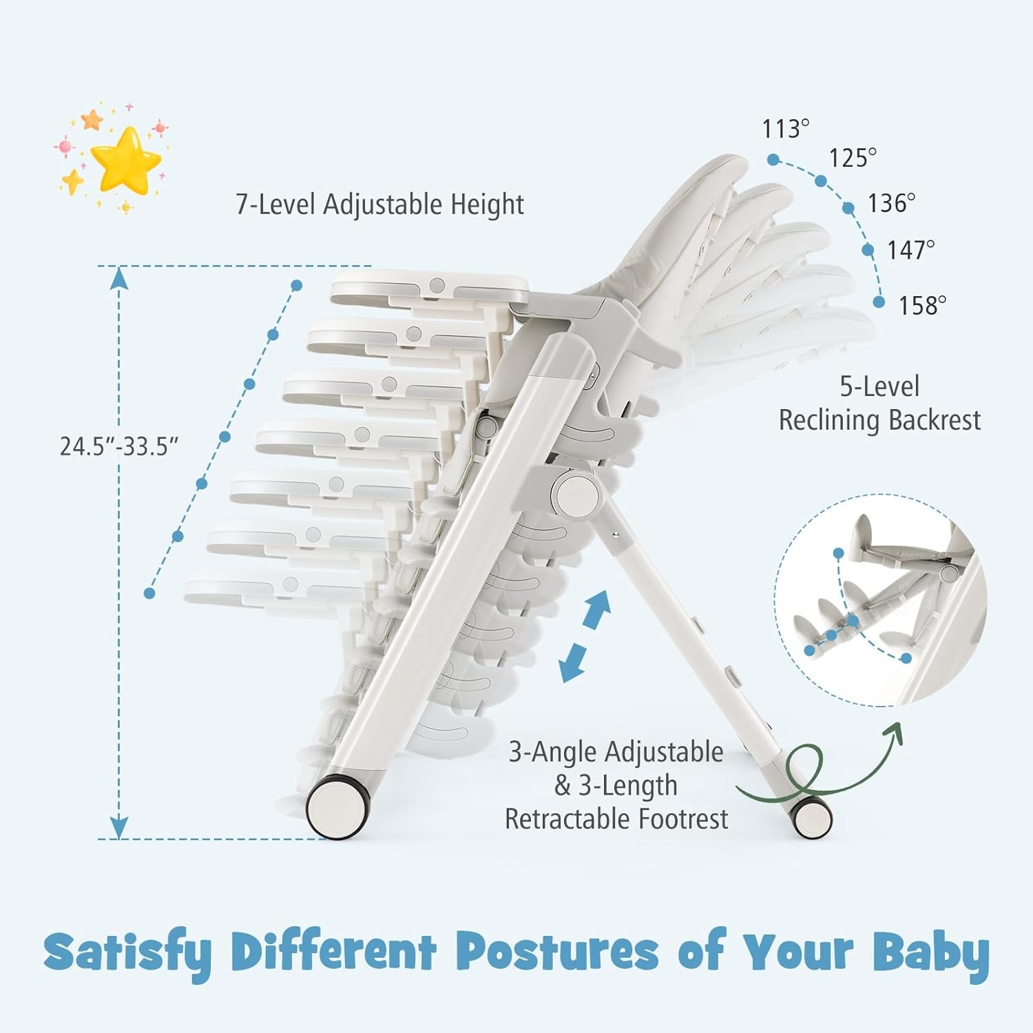 Adjustable Baby High Chair: This high chair has 7 height positions to accommodate dining tables or countertop of different heights. The 5-position reclining backrest and 3-position adjustable footrest allow baby to sit more comfortably. In addition, the food tray can be adjusted in 2 positions to provide more space and flexibility for fast-growing children. Suitable age: 6-36 months.