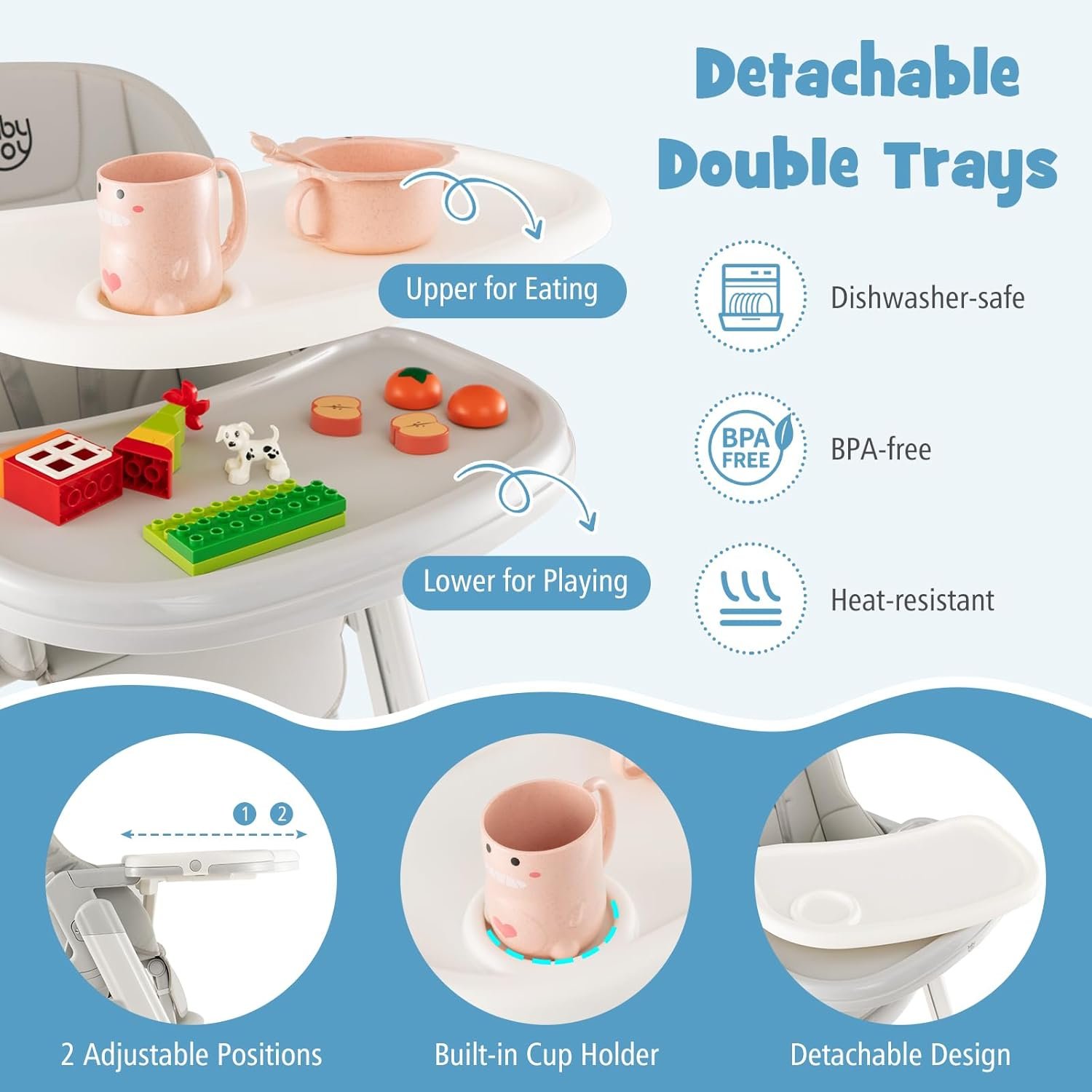 Removable Double Tray: This baby feeding chair comes with a double tray that can be easily removed as needed. The upper tray is suitable for eating and feeding with a built-in cup holder, and the lower tray is ideal for playing. The trays are made of BPA-free PP material, which is harmless to your baby’s health.