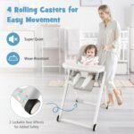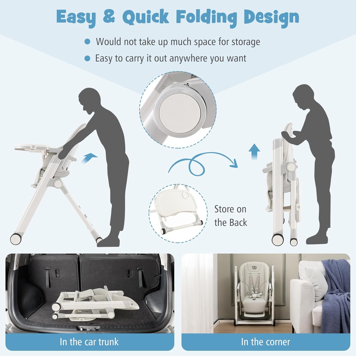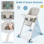 Simple Movement & Folding: The high chair is equipped with 4 smooth casters and two of which are rear wheels with brakes, so it can be moved smoothly to wherever you want and parked safely. What’s more, the foldable design with folding buttons makes the baby high chair not only easy to transport but also easy to store. Once folded, the tray can be attached to the rear legs to save space.