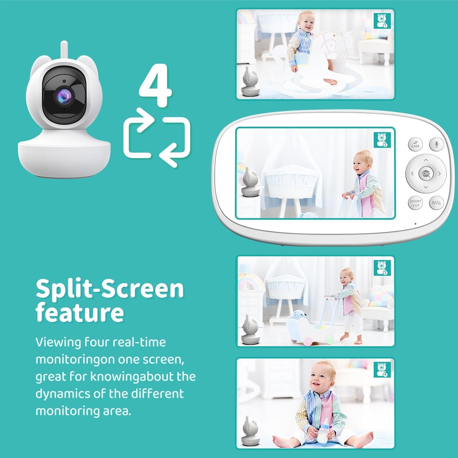 4 Split-Screen Feature —- Unlike the usual baby monitors, our VB10S video baby monitors is equipped with the 4 split-screen feature, allowing to see among cameras or babies side by side on the same screen. Therefore, you are able to see your baby’s activities in the different monitoring area instead of moving the baby camera. This baby monitor allows to connect up to 4 cameras in different rooms at the same time.