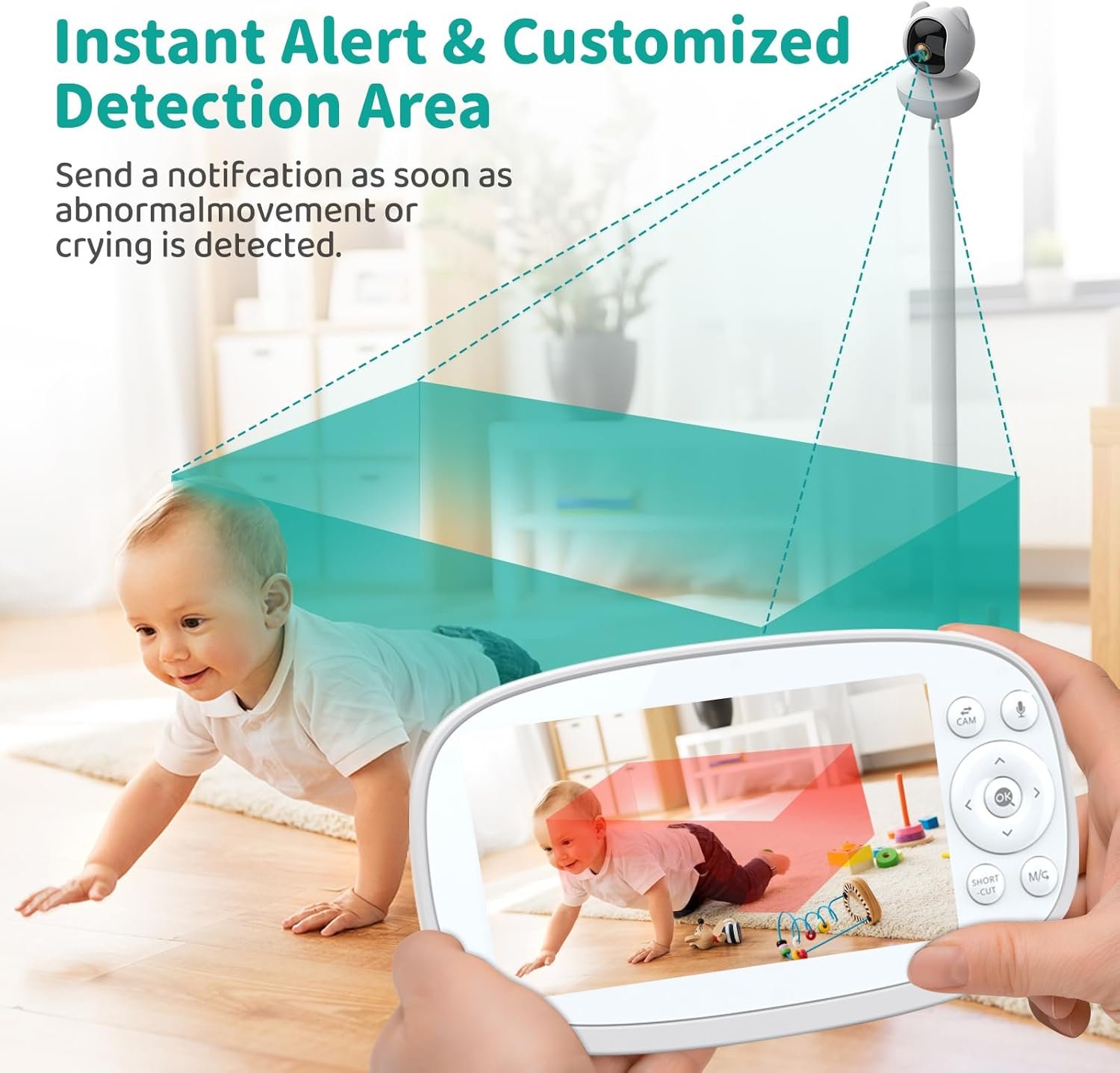 Virtual Fence Zone Seting and Alert —- This baby monitor with camera and audio supports customized detection area setting. You can preset a virtual fence for your baby’s motion range on the monitor. When your baby leave the fence range, the monitor will alert you.