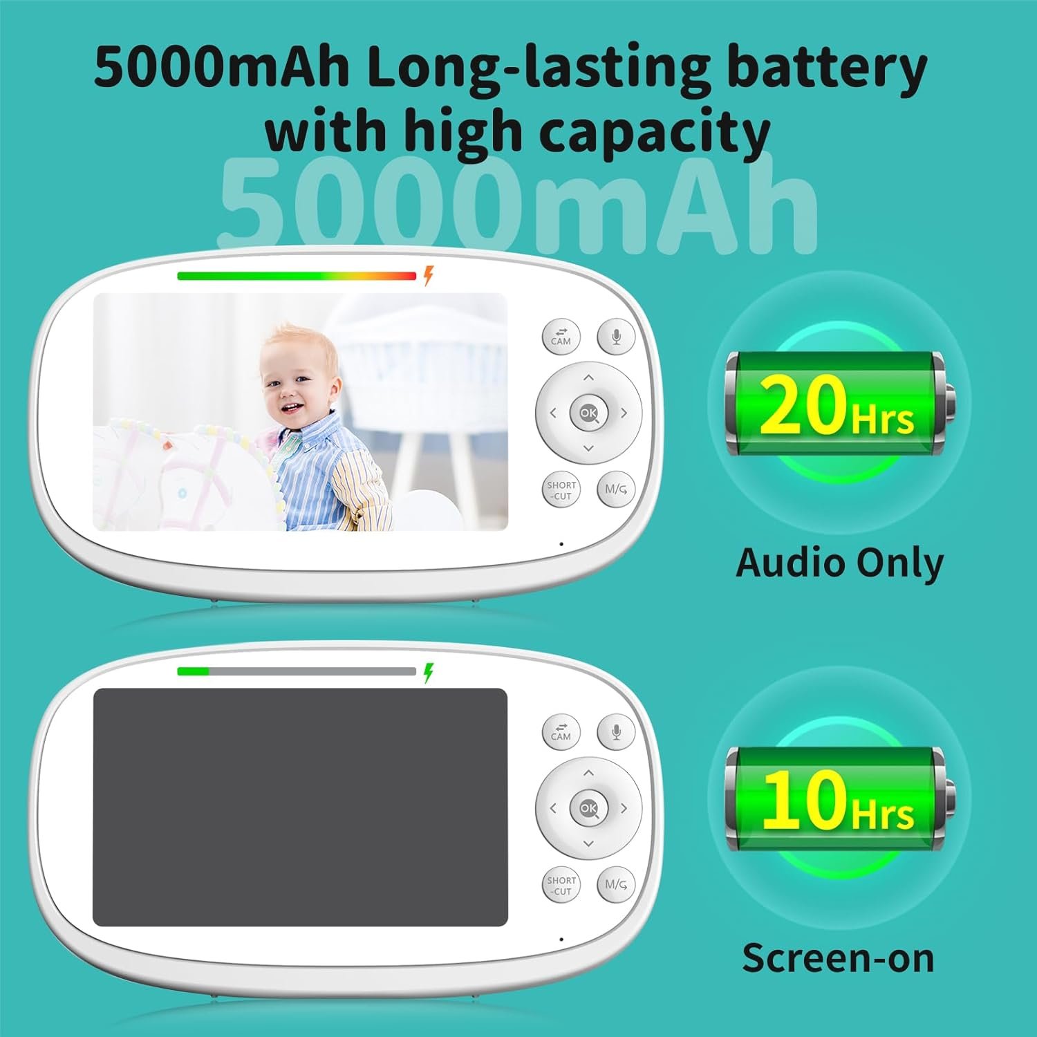 5.5 inch Baby Monitor with PTZ Camera —- VB10S baby camera supports 355° pan and 110° tilt adjustment, with the 110° viewing wide angle, this video baby monitor can bring you a much broader monitoring range from all directions. And equipped with a 5.5 inch 720P display for a clearer picture and a better view. We understand that your focus point is not merely at the middle, and hence this video baby monitor allows move the magnified scope freely and it is enlarged max 5X zoom in.