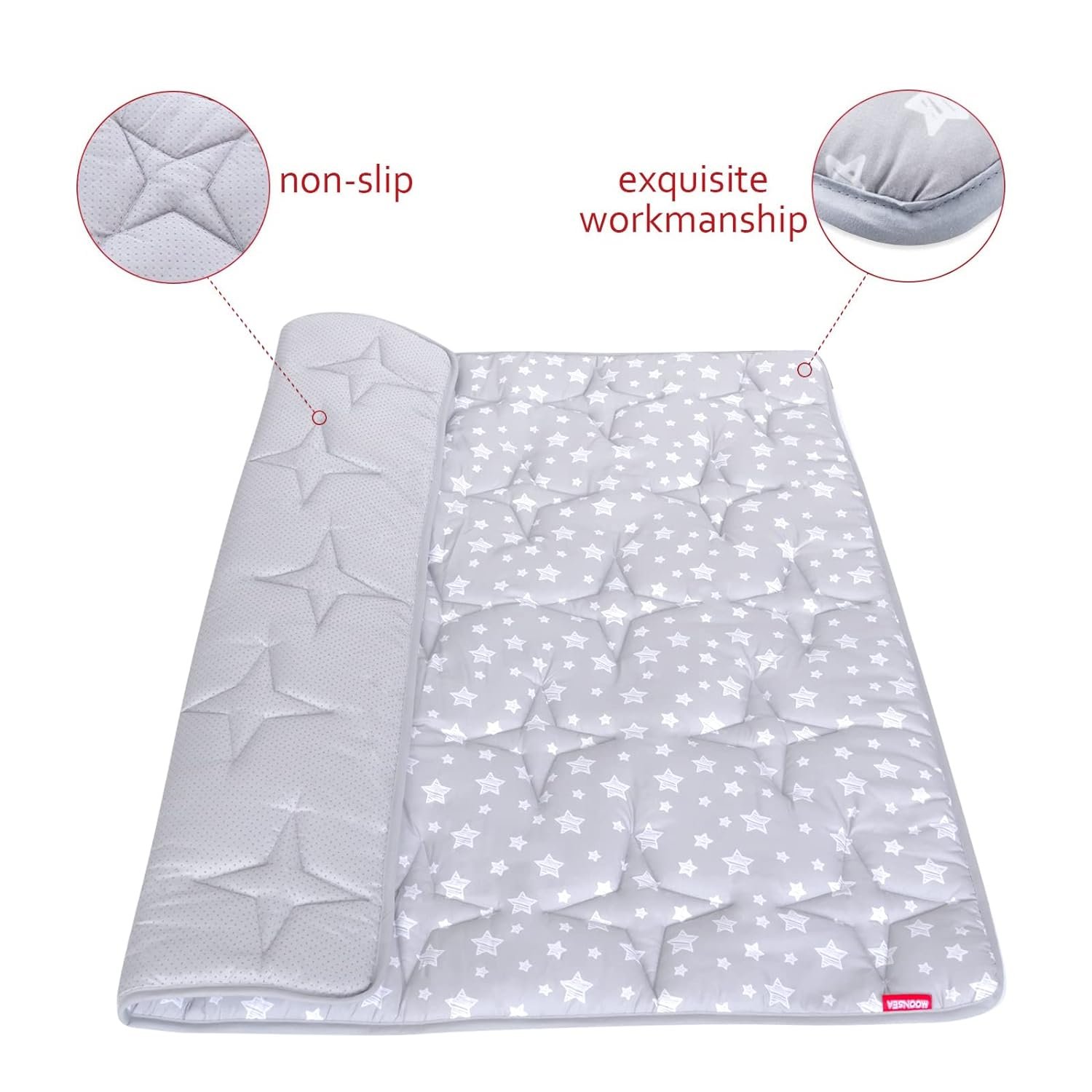 Thicker and Soft: This 50×50 play mat for playpen with thicker, soft padding makes it perfect for your baby to crawl around on or your toddler to play on.With the cute grey pattern and ultra soft fabric,“TESTED FOR HARMFUL SUBSTANCE” by GLOBAL OEKO-TEX, we ensure that your toddler will love this baby play mat.