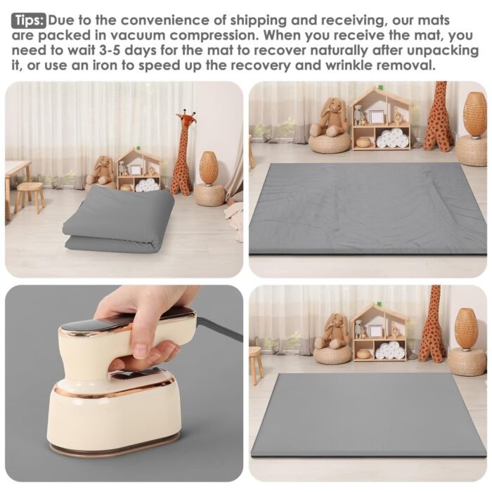 【Mat Care Guide]: 50” x 50” foldable children’s Play Mat for easy storage. Due to the compressed packaging, when you first receive the mat and open it, there will be creases, bulges, and unevenness. This is normal. It is recommended to iron it flat or leave it for 3-5 days for the mat to rebound before use. If it is a little smaller than expected, don’t worry, it will continue to expand until the mat returns to its original state.