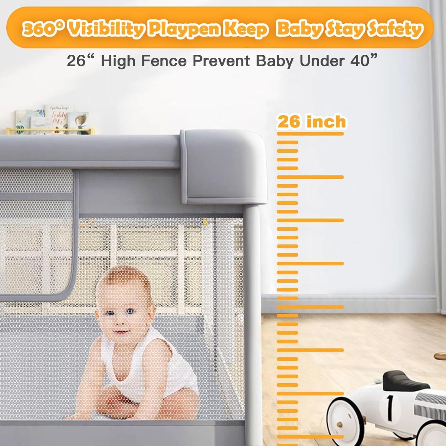 【360° All-Vision Design】The 360° all-vision design of this baby playpen allows parents to keep an eye on their little ones from all angles. Whether you’re in the kitchen or the living room, you can always monitor your baby’s activities with ease. Outter zipper design prevents the baby running out from the baby play pen active center accidentally.