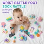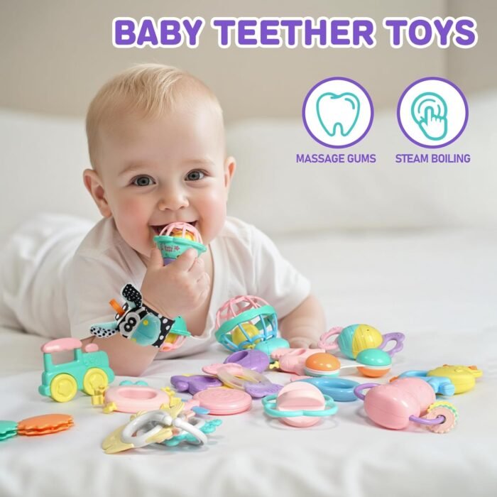 Teething Toys Boys Girls Gifts:An ideal baby shower gift! This Teether toys set supports key milestones from newborn through 6-12 months. Find the perfect rattle toys for babies 0-6 months and stimulating baby toys 6-12 months within this comprehensive collection. Beautifully packaged for gifting