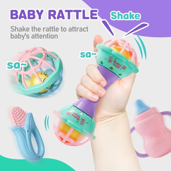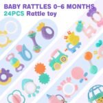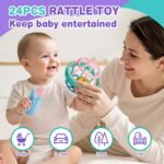 24PCS Rattles Toys Set: This baby toy set includes 24 distinct rattles and teethers producing engaging sounds. Babies 0-6 months discover cause-and-effect by shaking, boosting hand-eye coordination and visual tracking. Vibrant, high-contrast colors on each baby rattle 0-6 months aid early vision development