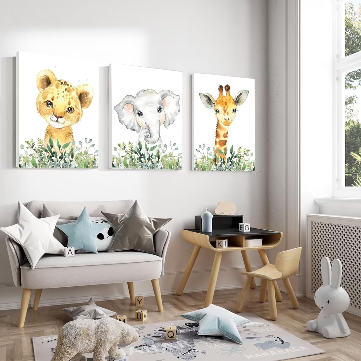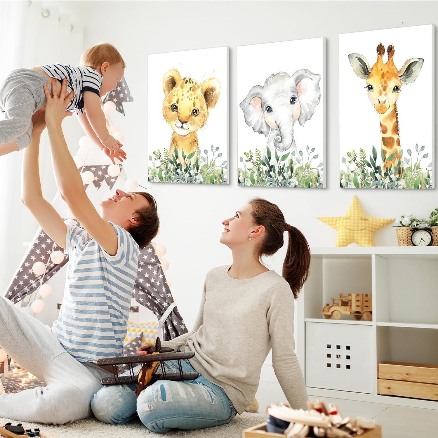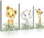 【BEST IDEA FOR KIDS ROOM DECOR】You will get a set of 3 framed watercolor portrait prints of safari baby animals, includes 3 Baby Animals: Giraffe, Elephant, and Lion,12X16 inches.