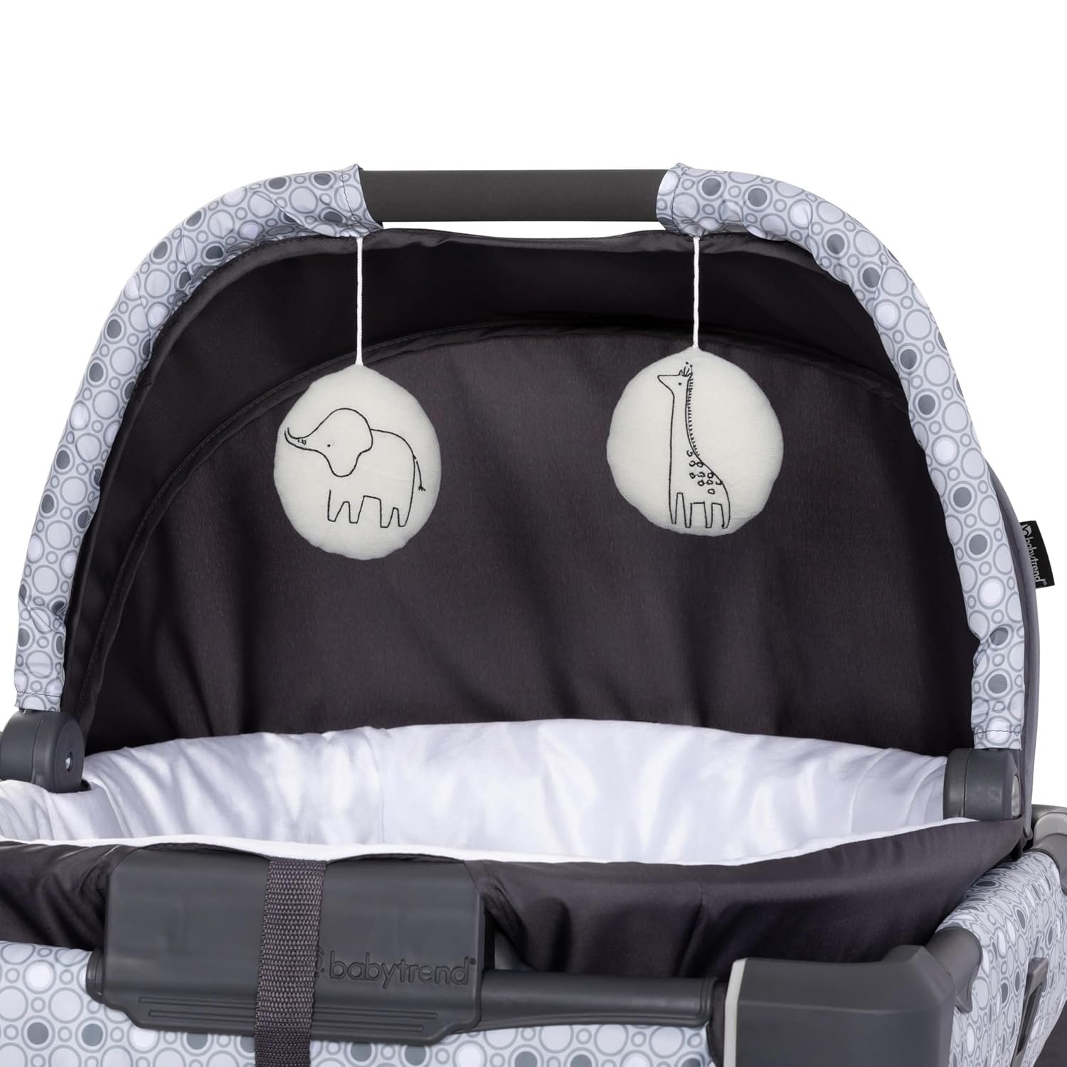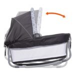 Includes removable and spacious portable cradle with rocking and stationary modes; cradle comes with canopy and carry handle, plush fabric and mesh sides for proper ventilation, and two plush hanging toys to encourage grasping and reaching