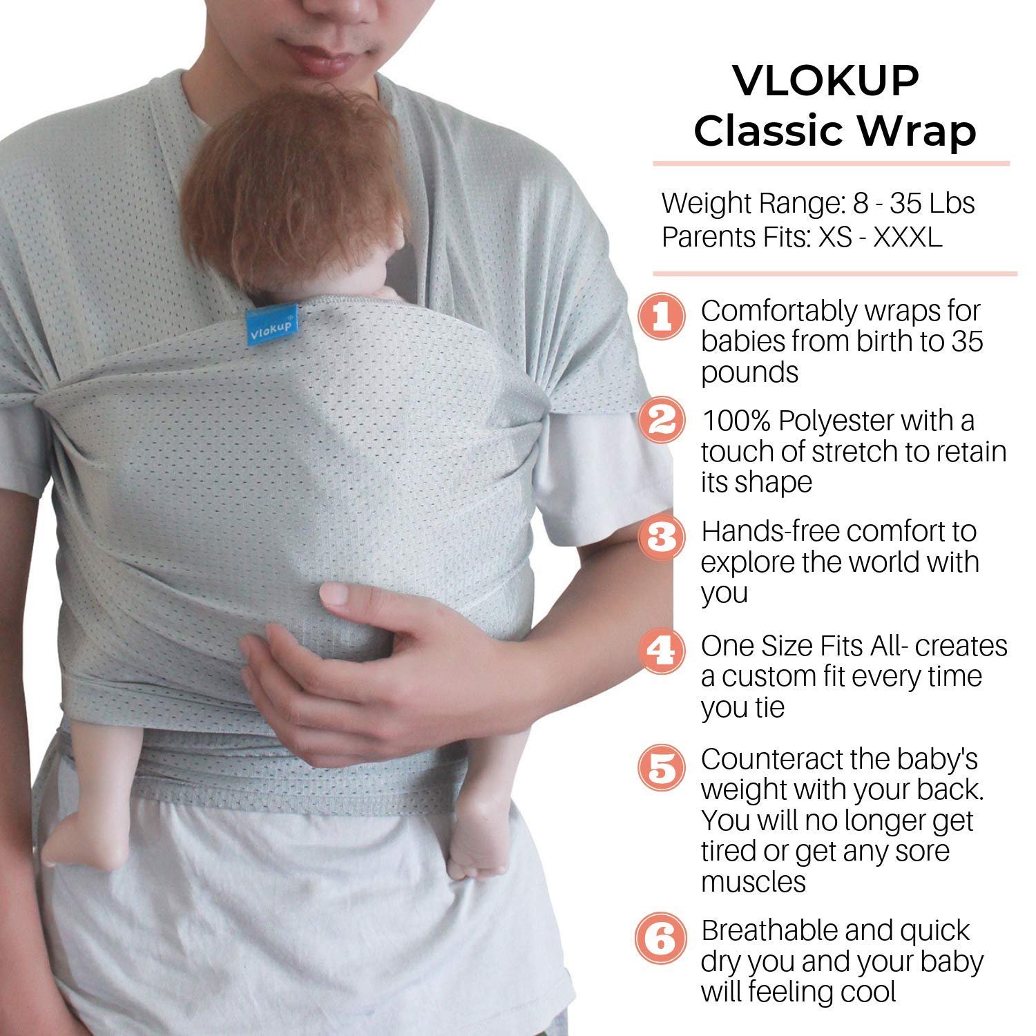 One Size Fits All – The Vlokup baby carrier is 5 meters long, 0.5 meters wide, meaning it can provide excellent support for your baby’s head, neck, back and gives a pleasant ride for the baby