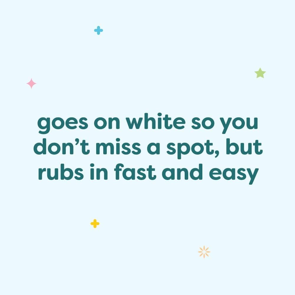 Goes on white so you don’t miss a spot, but rubs in fast and easy