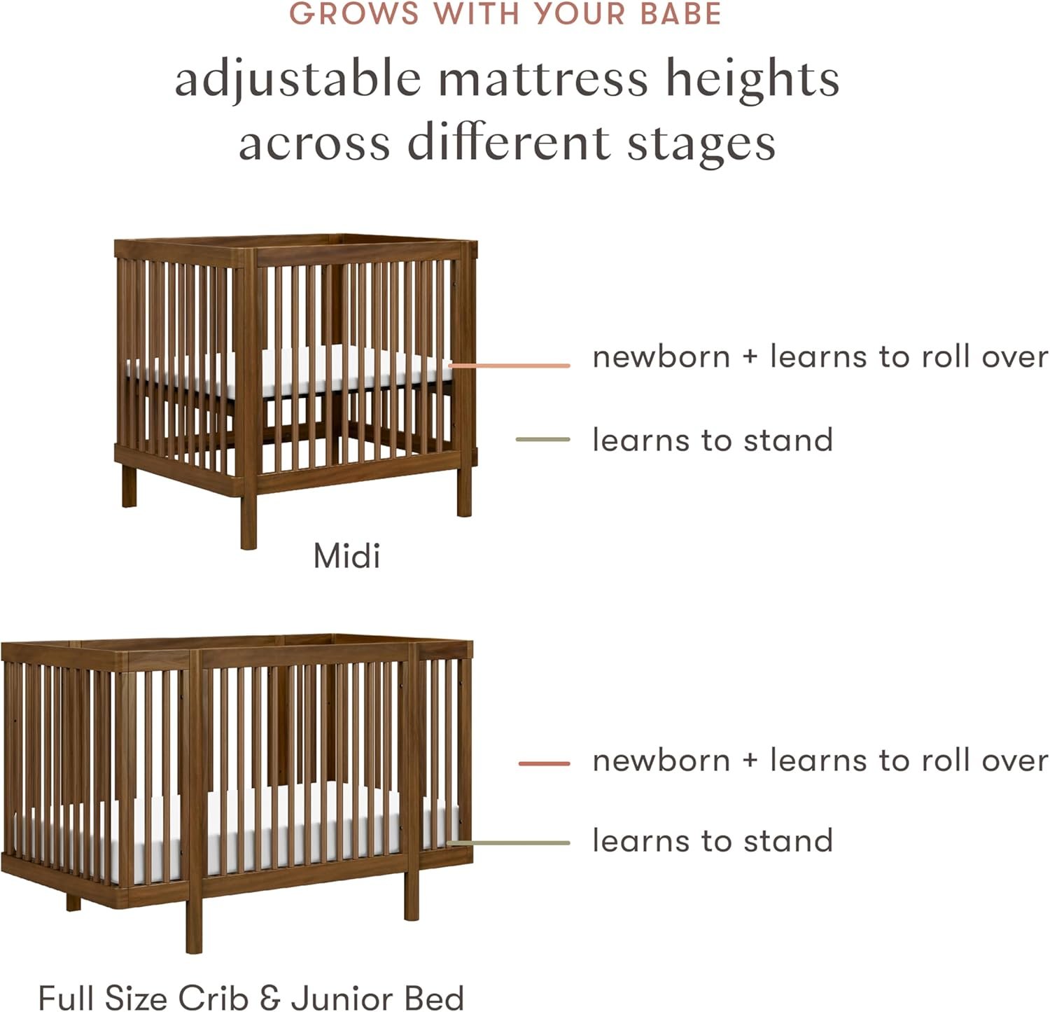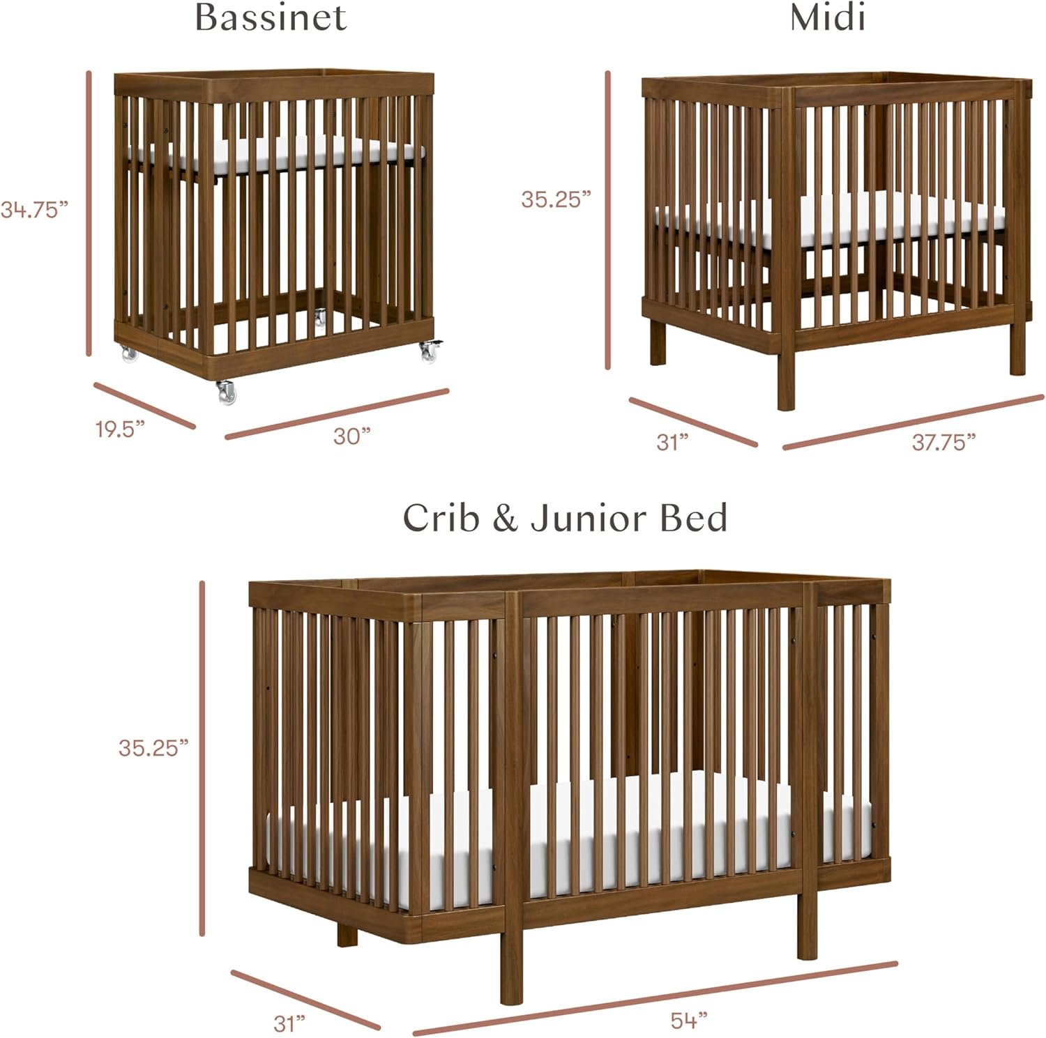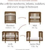 GROWS AT THEIR PACE & ADAPTS TO YOUR SPACE: Transitions from bassinet (30”x19.5”x34.75”) to transitional midi size (37.75”x31”x35.25”) and to standard full-size crib & junior bed. Suitable from newborn to 5 y/o