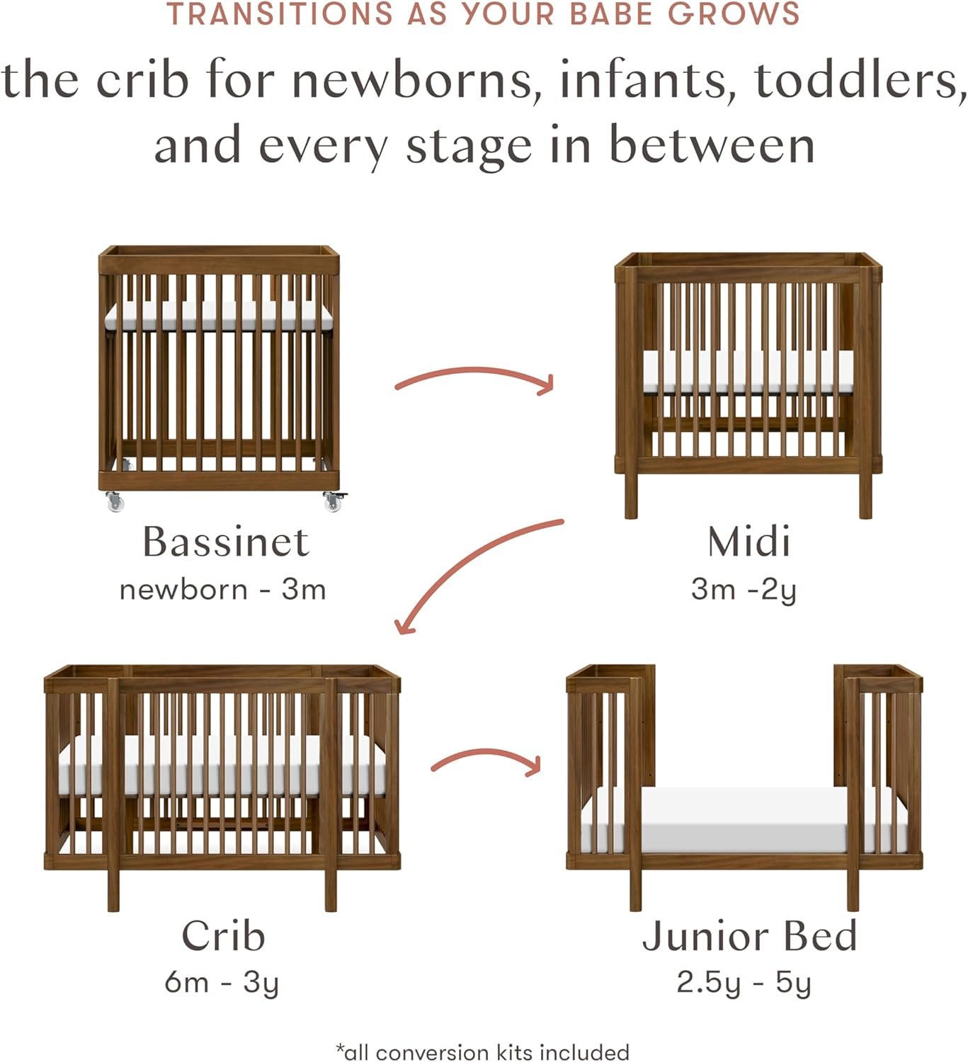 ALL-STAGES 8-IN-1 CONVERTIBILITY: 8 conversions across 3 unique sizes to fit your family & home: bassinet, midi crib, midi toddler bed, midi daybed, full-size crib, full toddler bed, full daybed, and junior bed.