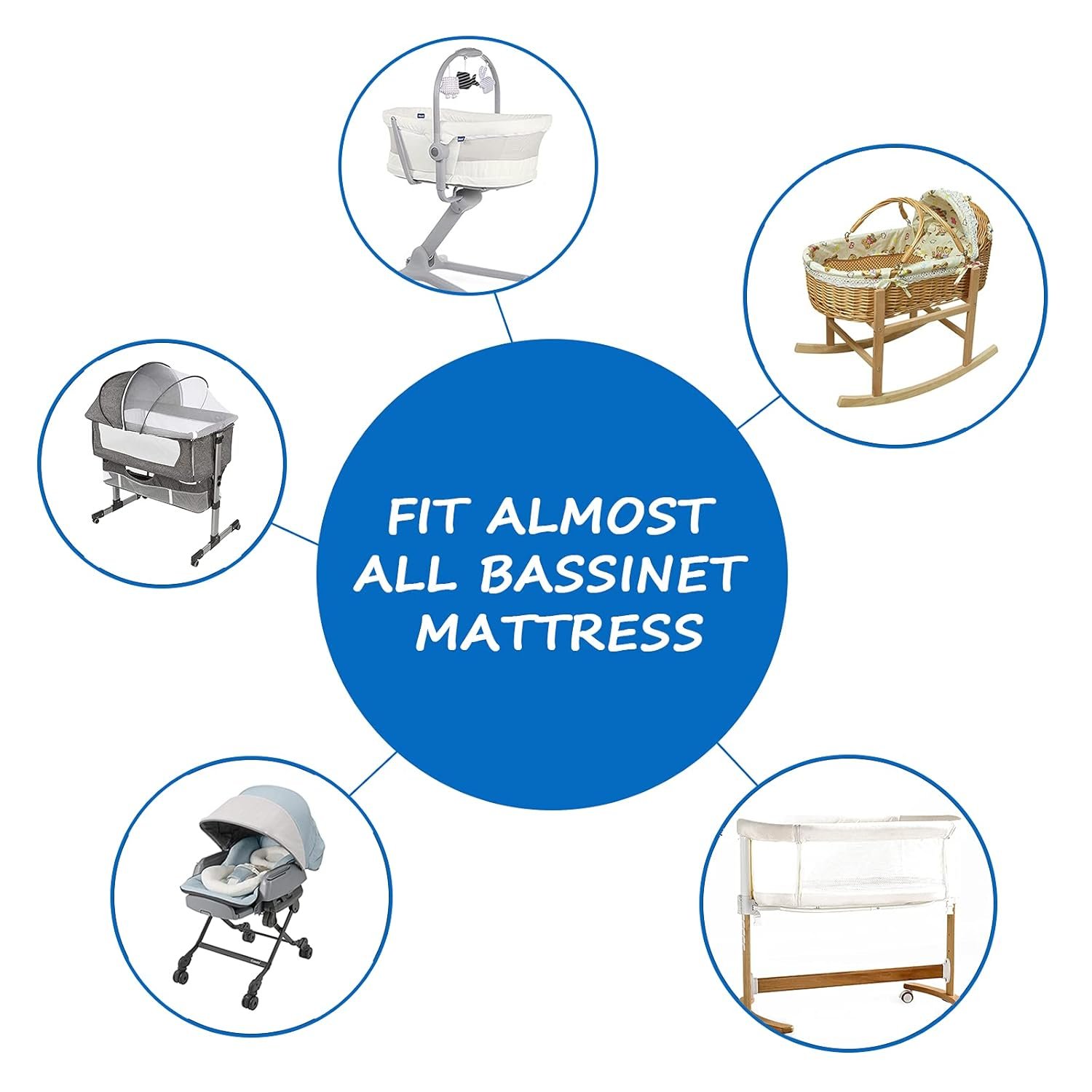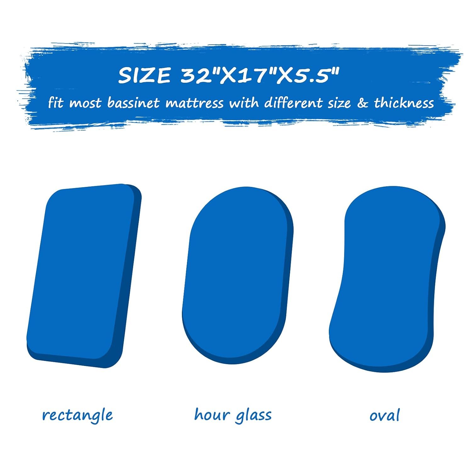 Not Only Fitted, But Snug: Measuring 32”x17”x5.5” Our bassinet mattress sheets fit almost all standard oval, round, rectangle, hourglass shaped bassinet mattress. Each baby bassinet sheet comes with an elastic band encased at the bottom for safety.