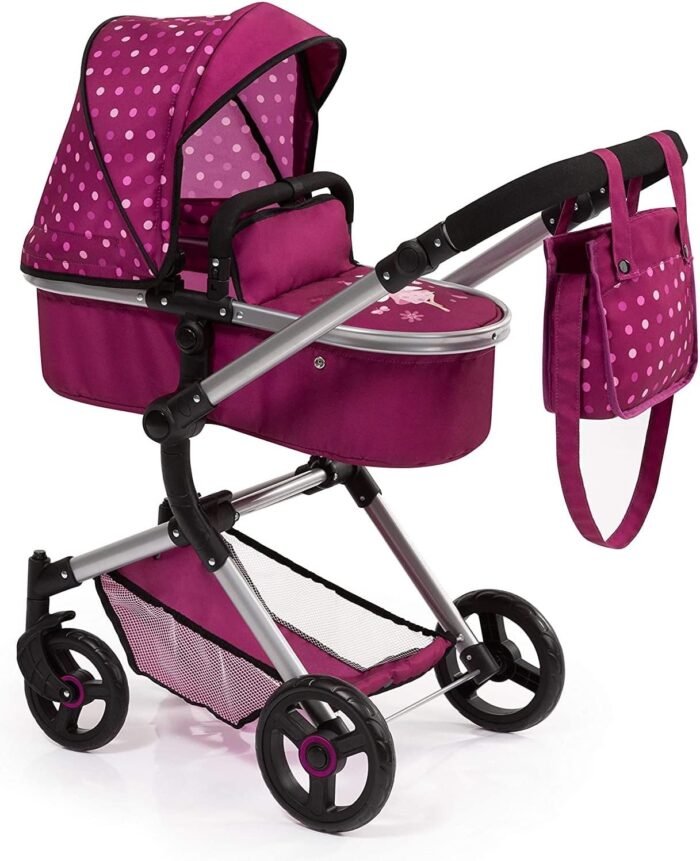 Vario is a modern designed combi doll’s pram and suitable for dolls up to 52 cm. With its adjustable handle (62 – 79 cm) this doll’s pram is easily adaptable to your child’s height; also it’s possible to mount the carrier in direction of travel or towards your child. Furthermore Vario has a reversible handle, thus the handle can be easily moved on both sides. Its also possible to change the angle of the carry cot the doll’s pram is convertible to a jogger pushchair in just a view seconds. The carrier’s cover can be positioned either way; if she’s sitting or lying in the pram; protect the little doll from the sun and wind. The pivoted front wheels guarantee a stable cornering. For transportation Vario can easily be folded. The accompanying bag has a long handle to be used as a shoulder bag and two short ones as a hand bag. Additionally, it includes a zipper to close the bag safely. For more storage space the integrated shopping basket is also perfect to keep everything stored and safe.