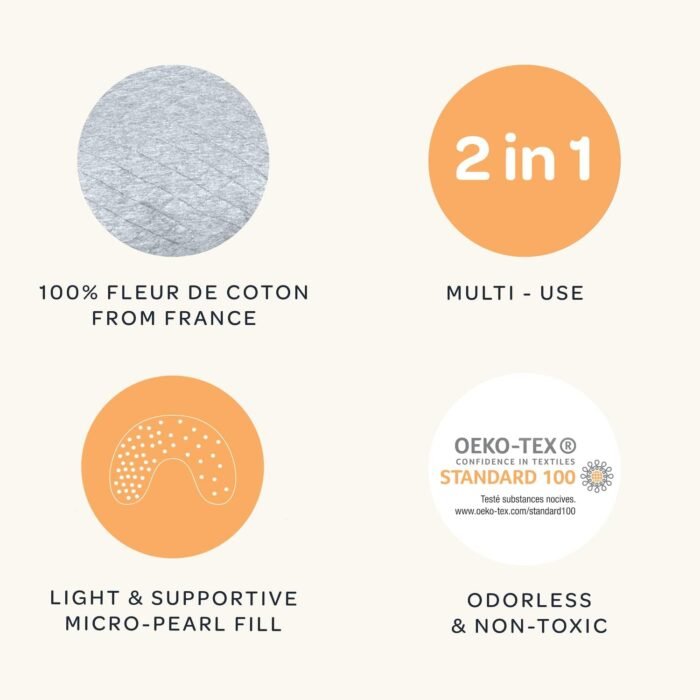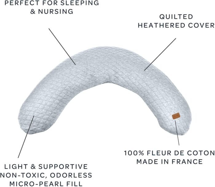 Thoughtfully designed with light & supportive micro-pearl filling, which sets it apart from traditional stiff pregnancy pillows. This innovative filling allows the pillow to move & contour seamlessly to your body, providing targeted support where you need it most. Whether you’re sleeping, relaxing, or nursing, this pillow adapts to your changing needs, ensuring optimal comfort for both mom & baby. Crafted from 100% quilted French cotton fabric, adds a touch of elegance to your maternity essentials while ensuring a gentle experience against your skin. Plus, it is OEKO-TEX certified, meaning it is free from harmful substances, giving you peace of mind for both you & your little one.
