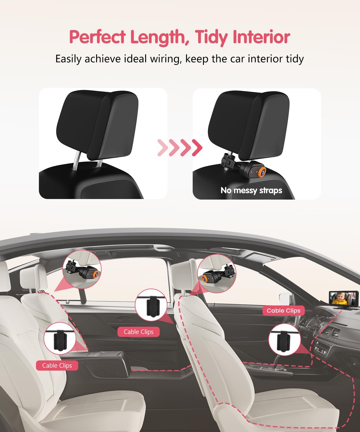 𝗘𝘅𝘁𝗿𝗮-𝗟𝗼𝗻𝗴 𝗖𝗮𝗯𝗹𝗲: Extra-long 22ft (6.7m) cable fits 99% of cars—no need for extra cords. This car camera for baby 2 cameras for rear facing infants works perfectly in SUVs, sedans, and more. Cable clips included for a clean, tidy setup.