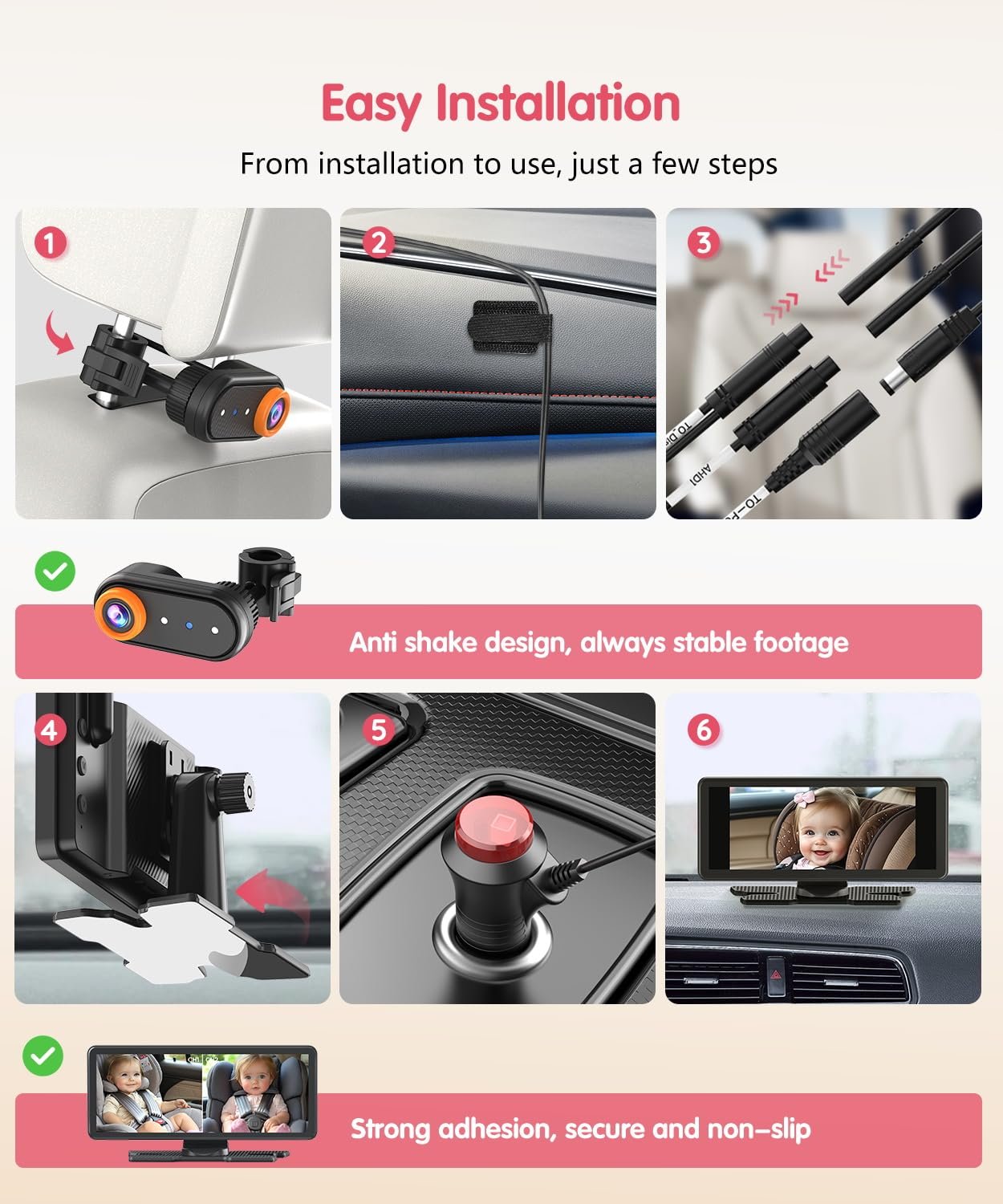 𝗘𝗮𝘀𝘆 𝗜𝗻𝘀𝘁𝗮𝗹𝗹𝗮𝘁𝗶𝗼𝗻: This car baby monitor installs in minutes with no tools required and fits most vehicles. Parents can quickly secure and start using this double car camera for 2 baby, making every trip safer and more convenient without hassle.