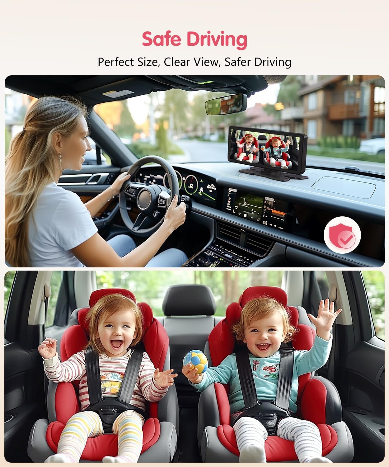 𝗗𝘂𝗮𝗹 𝗖𝗮𝗺𝗲𝗿𝗮 𝗦𝗽𝗹𝗶𝘁-𝗦𝗰𝗿𝗲𝗲𝗻 𝗗𝗶𝘀𝗽𝗹𝗮𝘆: This dual car camera baby monitor ensures no distortion, even when switching between single and dual channels. As a reliable baby car camera, it allows you to monitor 2 kids at the same time, providing peace of mind during every trip.